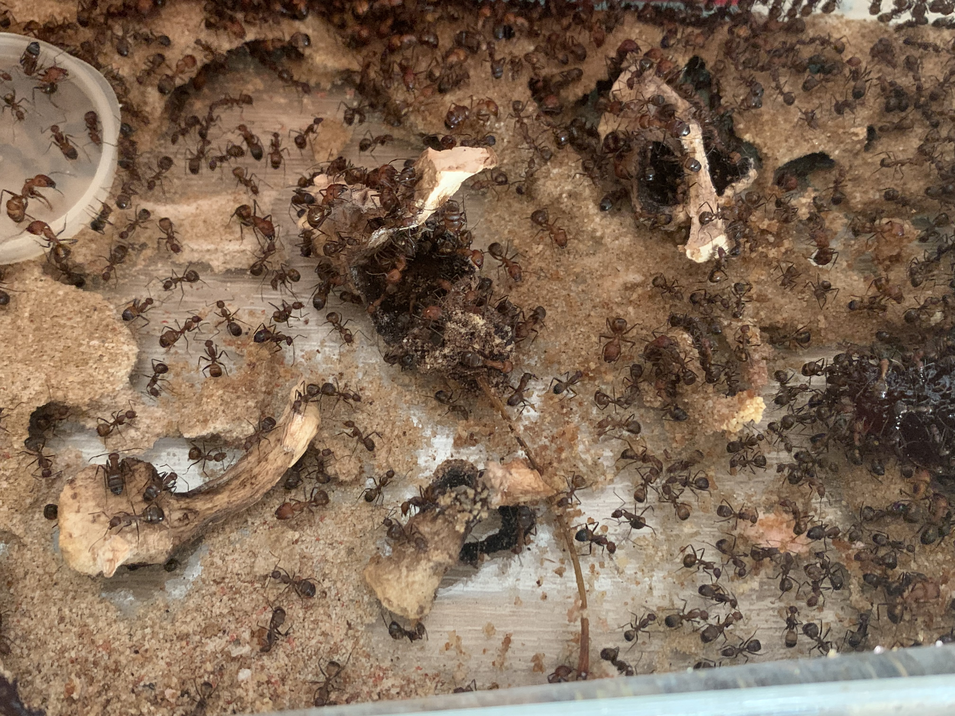 Gemäß den unterstehenden Fotos haben die Ameisen nun drei Wochen Ruhe vor mir. Ich habe ihnen so Reagenzgläser mit Wasser und Invertzucker:Wasserlösung in die Arenen gelegt, drei Fruchtjellys (die sind jetzt bestimmt schon alle) und drei grosse Heuschrecken sind in der einten Arena (jetzt bestimmt auch schon Tod).