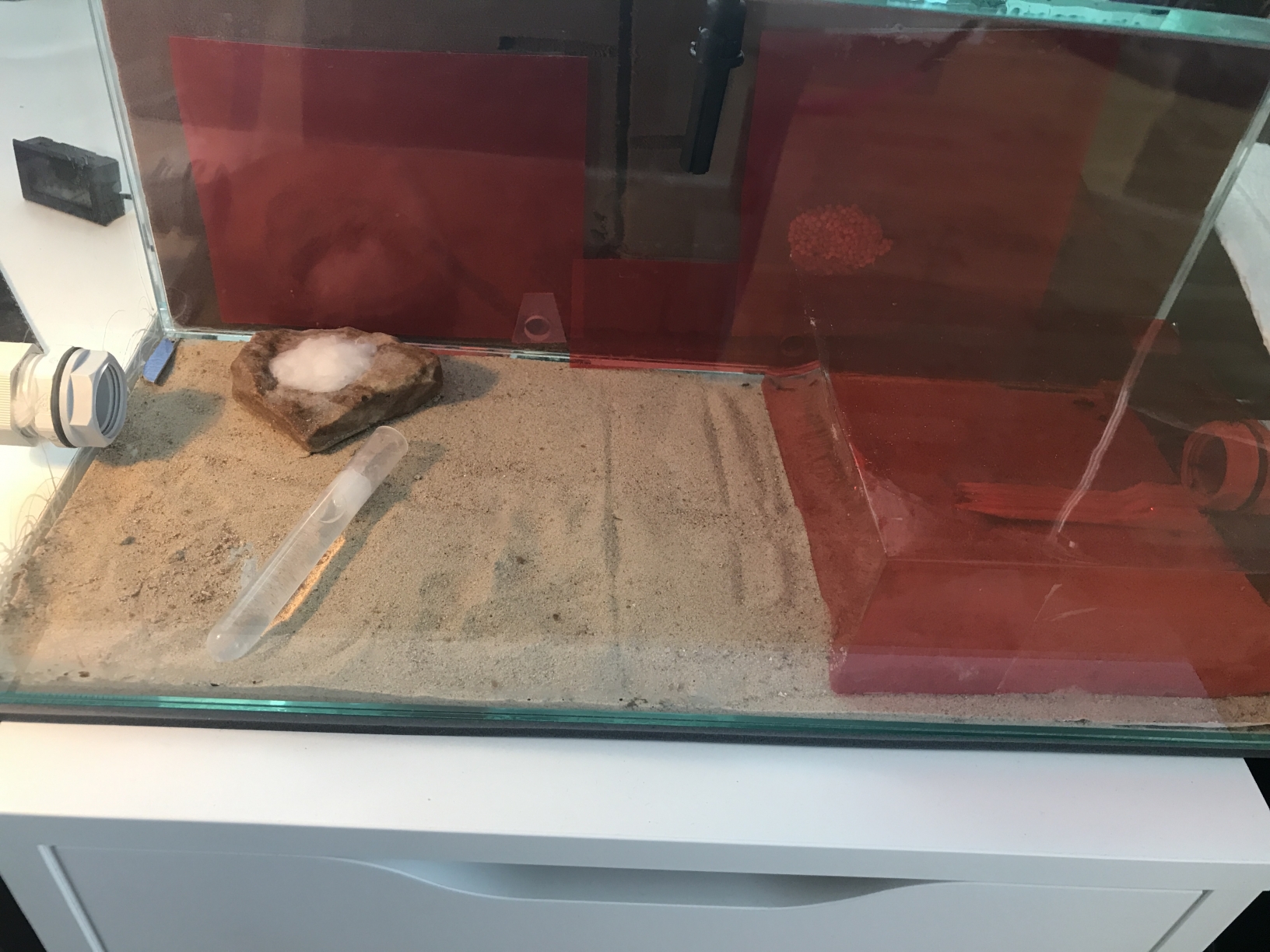 Der Deckel ist dauerhaft geschlossen. Eine Öffnung ist zugestöpselt, die andere führt per Schlauch zur neuen Arena. Das alte Nest ist nicht mehr abgedunkelt, der abgedunkelte Bereich beginnt am Ausgang (Schlauch) Richtung neue Arena.