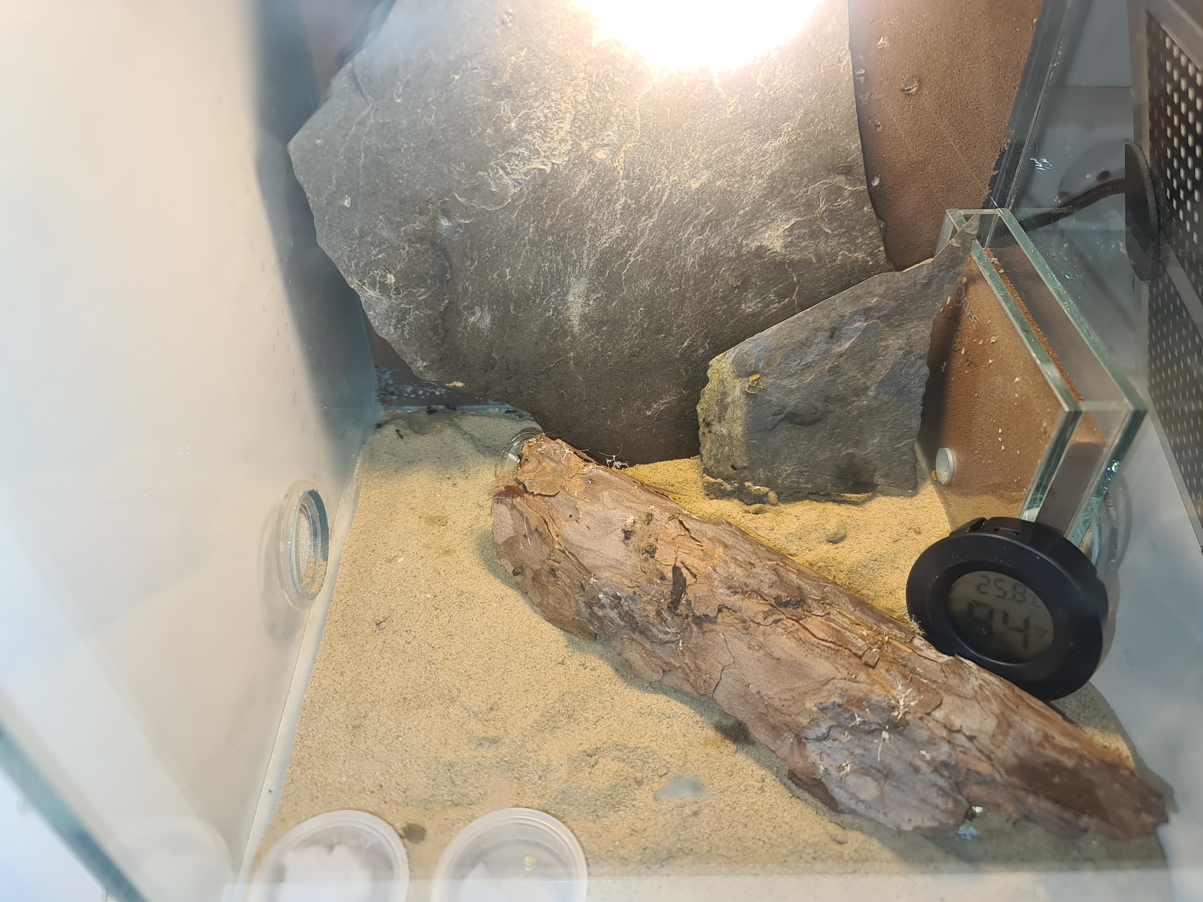 Durchschnittliche Luftfeuchtigkeit 50 bis 65%, Reagenzglas mit Wasserreservoir steht dauerhaft zur VerfĂŒgung und wird von den Messor zur Unterbringung von Puppen genutzt.