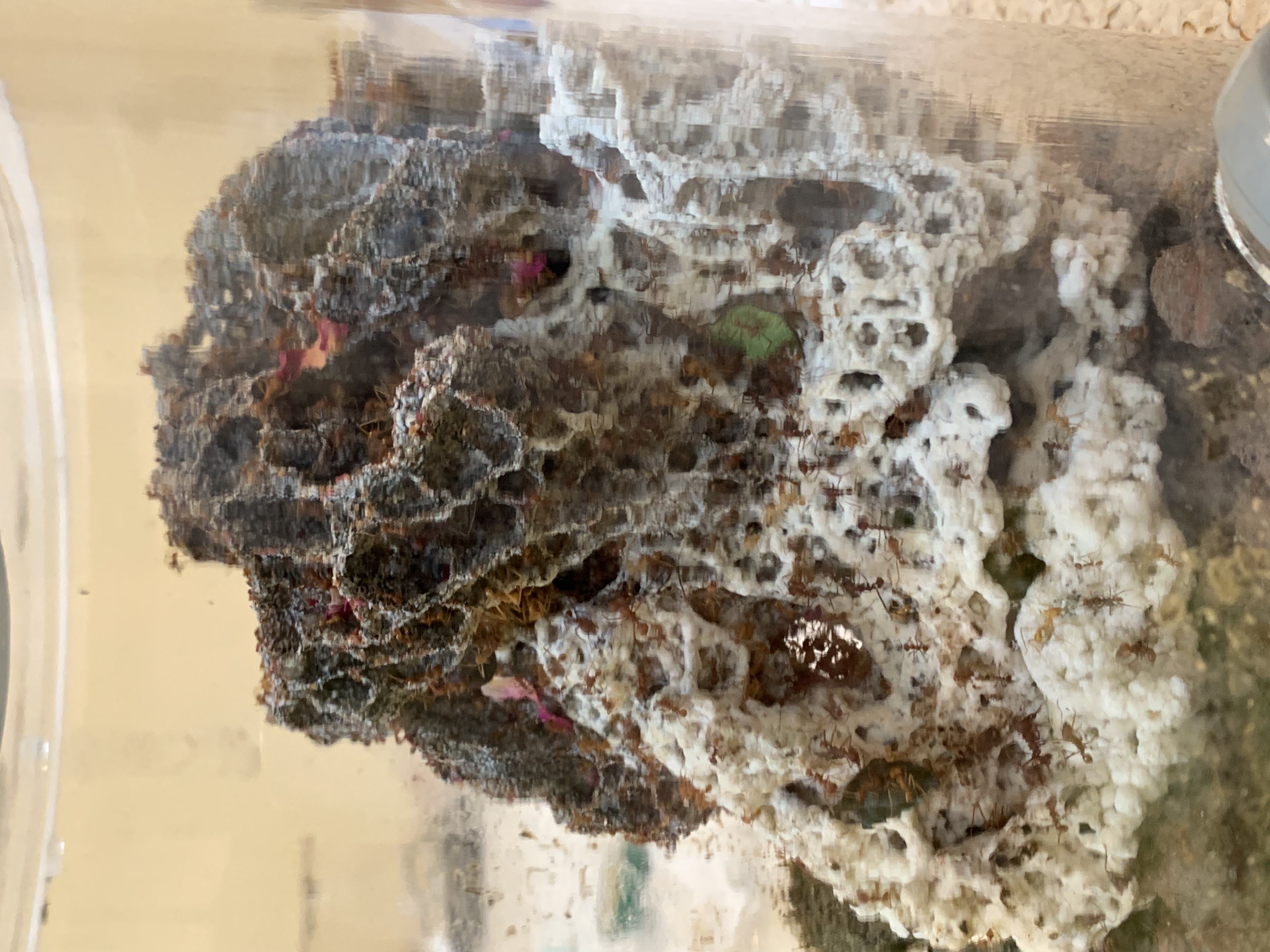 Zu den Atta: Der Pilz wächst sehr gut und die Kolonie ebenso. Das Problem mit den schwarzen Stellen am Pilz hat sich gelegt, da der Pilz umgefallen ist und von den angeschlagenen Stellen der Scheibe weg ist. Seit dem der Pilz umgefallen ist kann man beobachten wie 10-20 Ameisen die kleinen Tröpfchen an der Scheibe trinken.