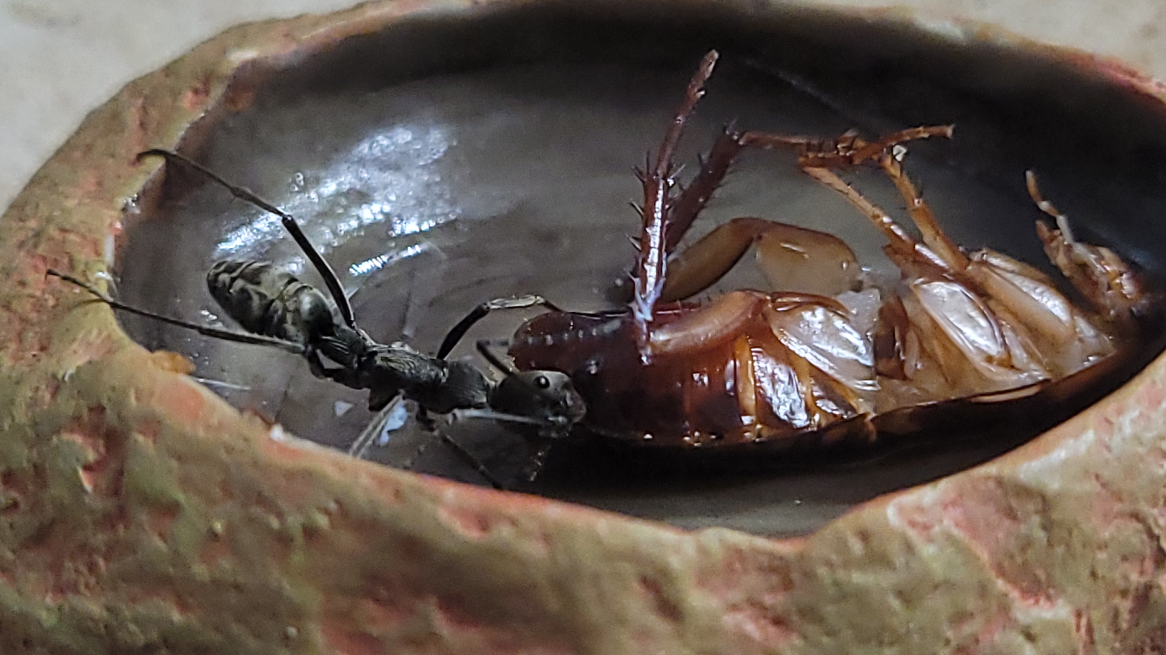 Noch eine Frage an die Profis hier, die Diacamma benötigen ja vor allem viel Eiweiss. Gemäss AmeisenWiki am besten frisch. Heisst das, ich könnte die auch jetzt schon jagen lassen? Und wie viel ist viel Protein bei der grösse an Kolonie (geschätzt 20-30 Arbeiterinnen). Seit Freitag haben Sie total 2 Schokoschaben und 1.5 Mehlwürmer bekommen. Die beiden Schaben sind weggeputzt (das zweite Skelett wurde gestern entsorgt) und aktuell haben Sie 1 mittlere und 1 kleine Heuschrecke im Futterschälchen. Die Tiere habe ich bisher einfach mit kochendem Wasser überbrüht bevor ich die an die Ameisen gegeben habe.
