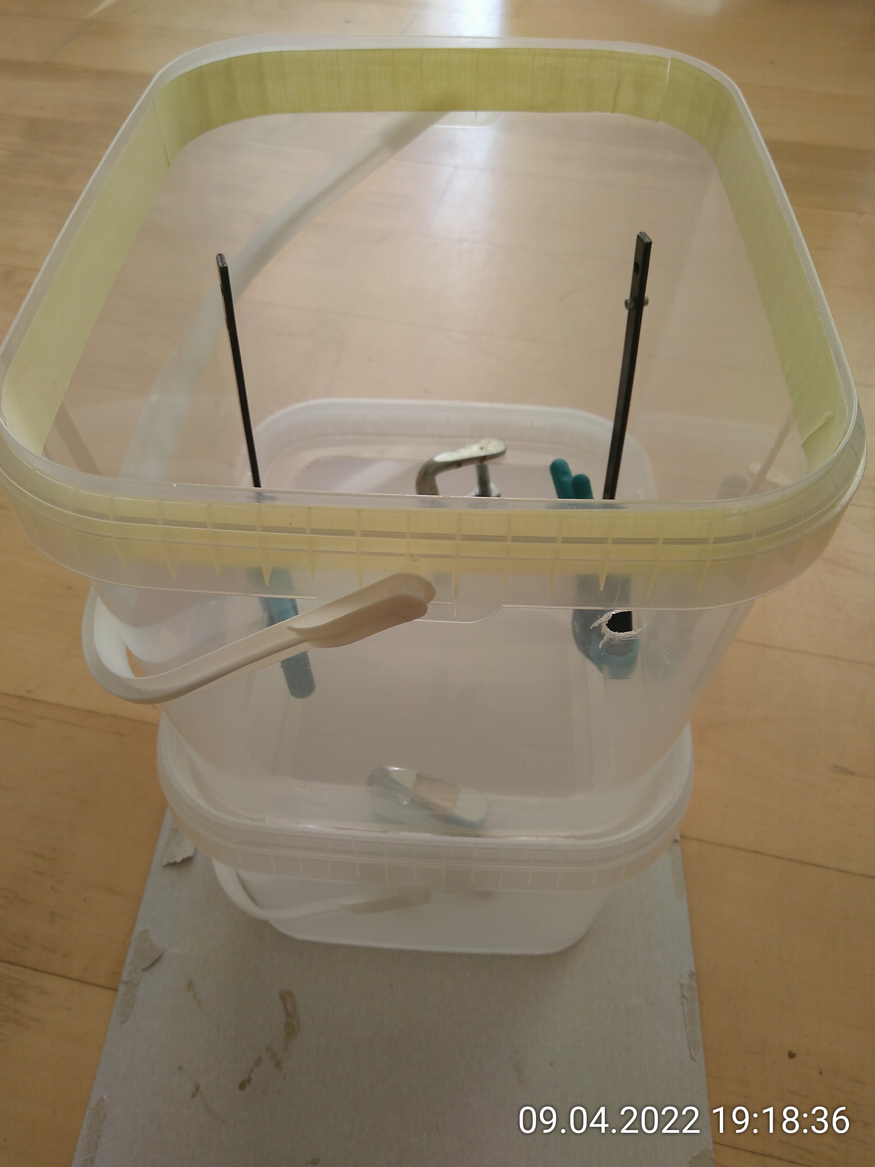 Auf dem Bild ist alles zu sehen, was heute passiert ist. ich habe die beiden Teile mit Silikon verklebt, ein Loch für den Zugang gebohrt und das doppelseitige Klebeband angebracht.