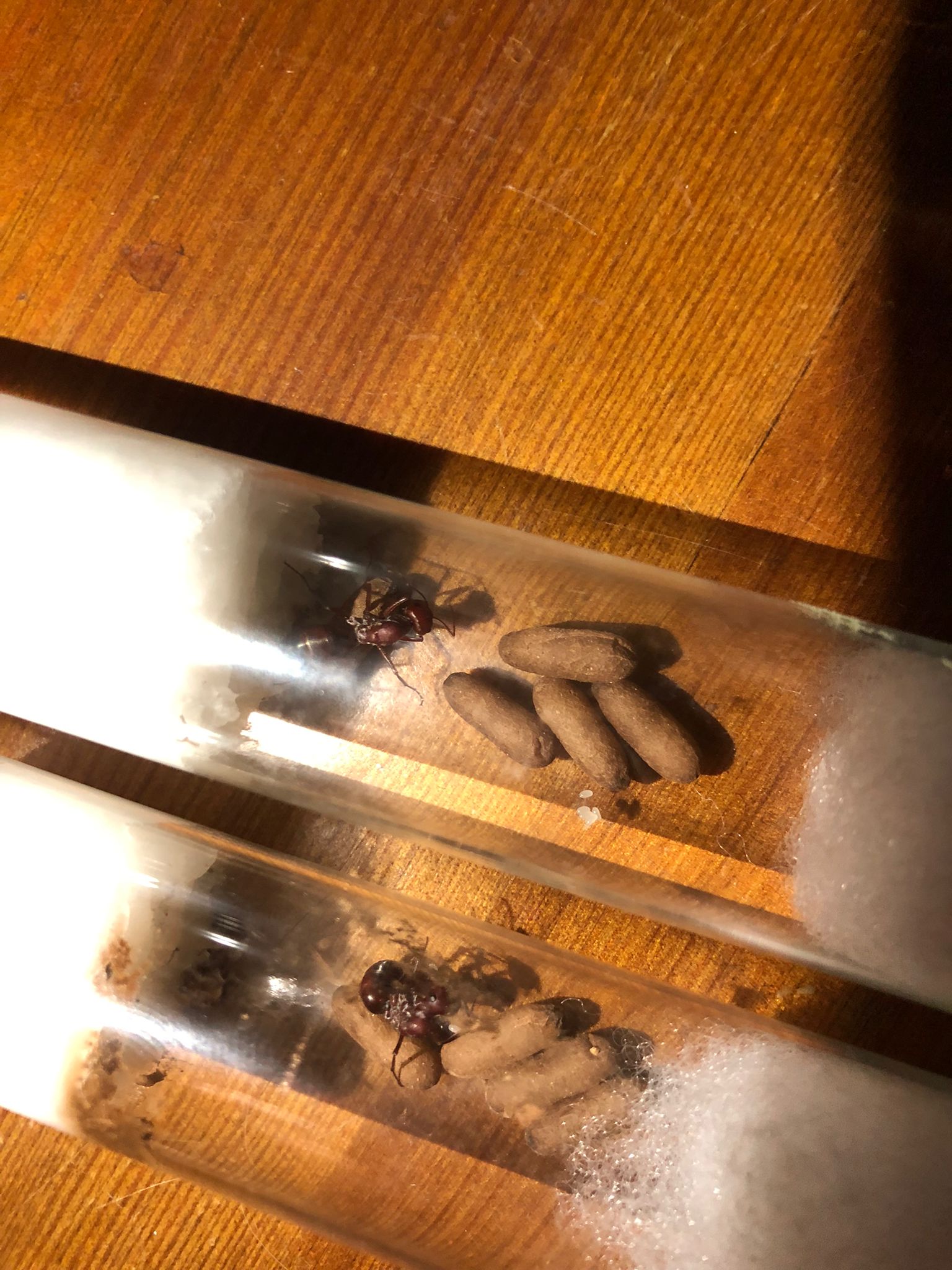 Zu unserer großen Freude entdeckten wir nun auch bei der zweiten Gyne einen größeren Eierhaufen (~10 Eier). Es fiel uns auch auf, dass die erste Gyne an einem Kokon zu beißen begann. Es scheinte auch ein Fühler rauszuschauen. Das ließ uns hoffen, bei unserer Rückkehr evtl. eine erste Arbeiterin zu entdecken.