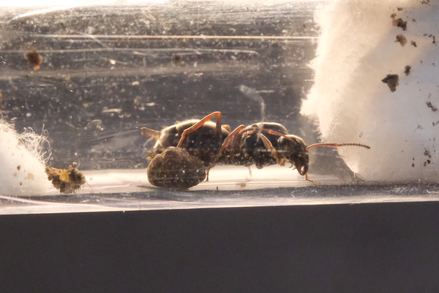 Gestern war wohl Schwarmflug, in unserer Einfahrt. Dutzende Königinnen sind umher gekrabbelt und wir haben ein paar eingesammelt. Optisch sind sie erstmal recht ähnlich, durch die Röhrchen habe ich aber noch kein (ausreichend) scharfes Foto machen können. :)