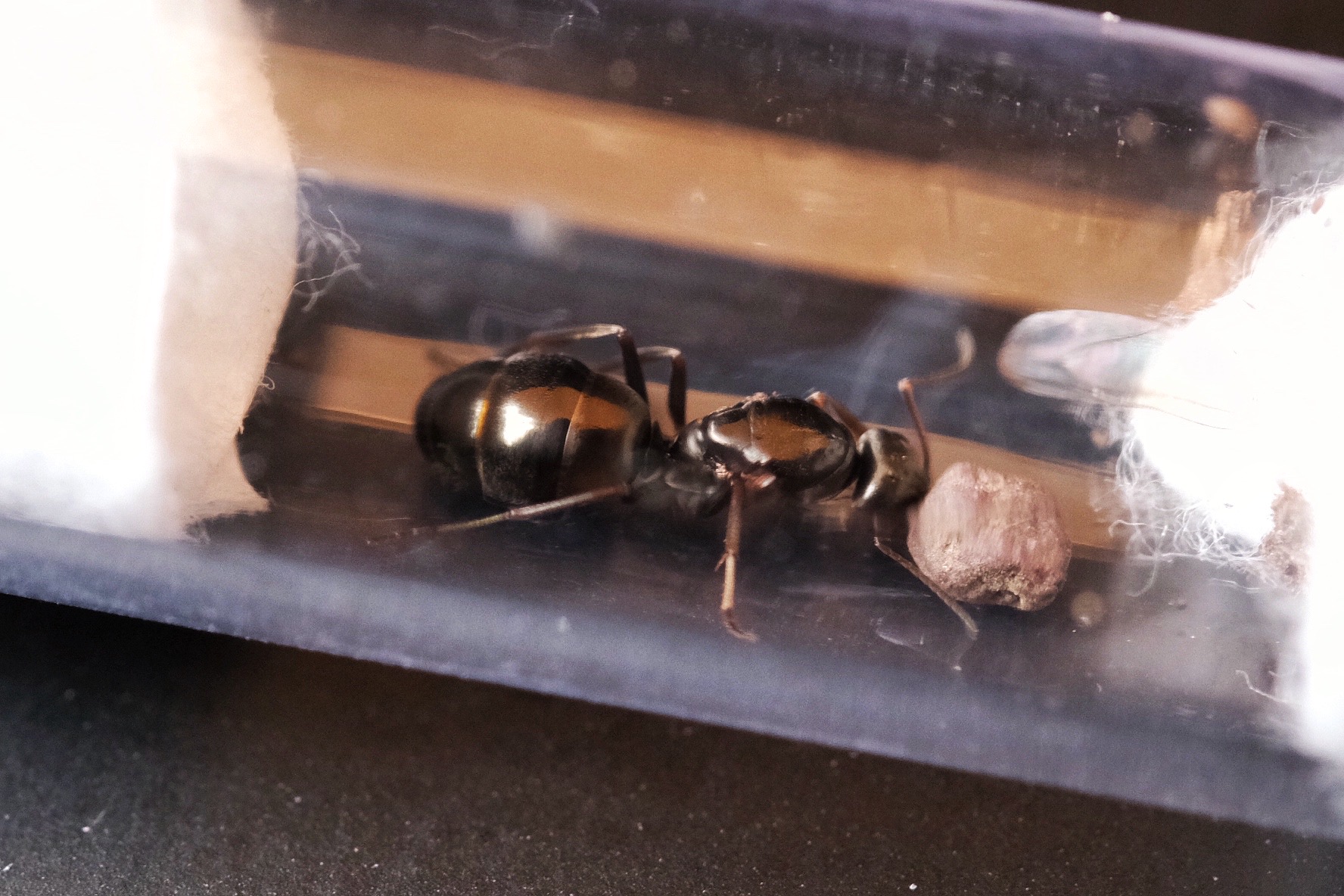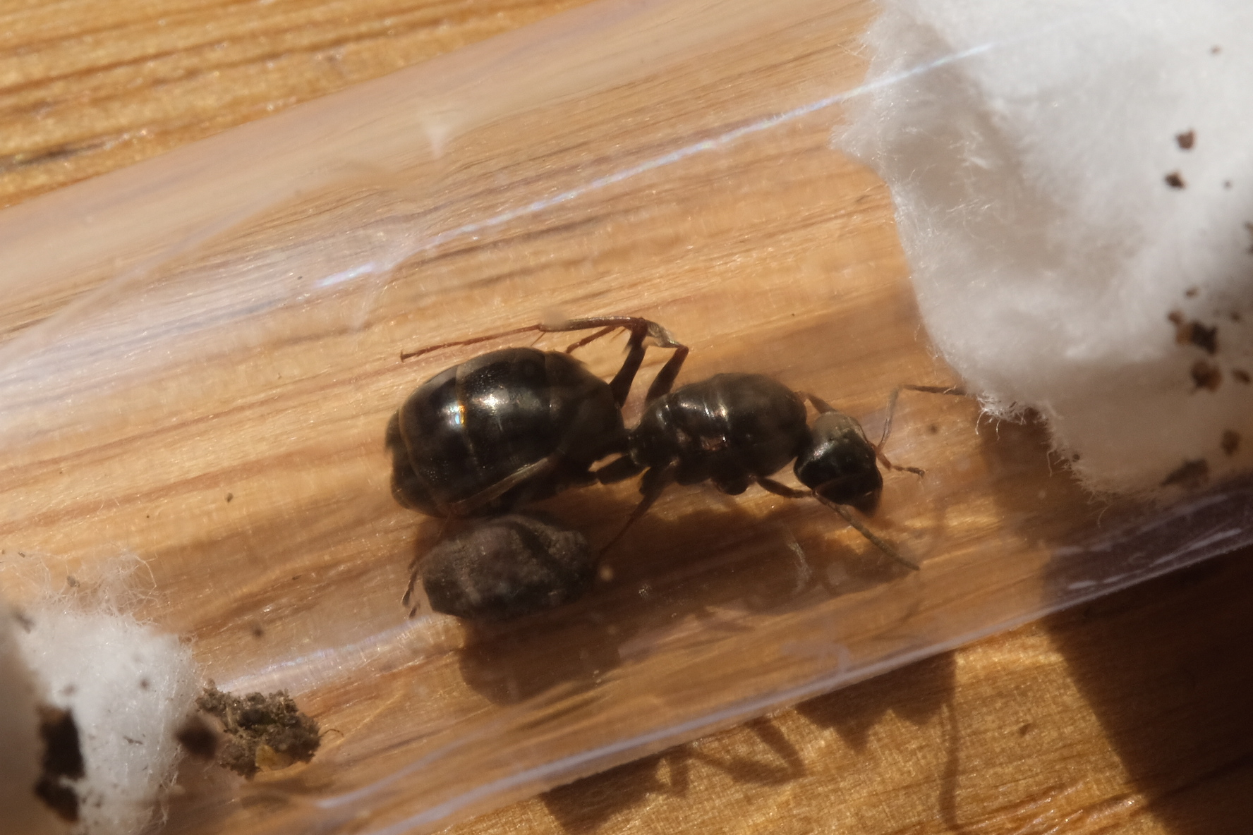 Nun sind wir bereits viele Jahre relativ aktiv (Wandern, Fahrrad, Zelten, etc.) und geben in den letzten Wochen vermerkt Acht auf das, was am Boden so wuselt. Da ist uns vorhin, beim nächsten Park, im halbschattigen Bereich, eine Königin "neben die Füße gelaufen" und wir haben sie mitgenommen. Aktuell steckt sie in einem Kunststoffröhrchen, mit Wasservorrat und Watte.