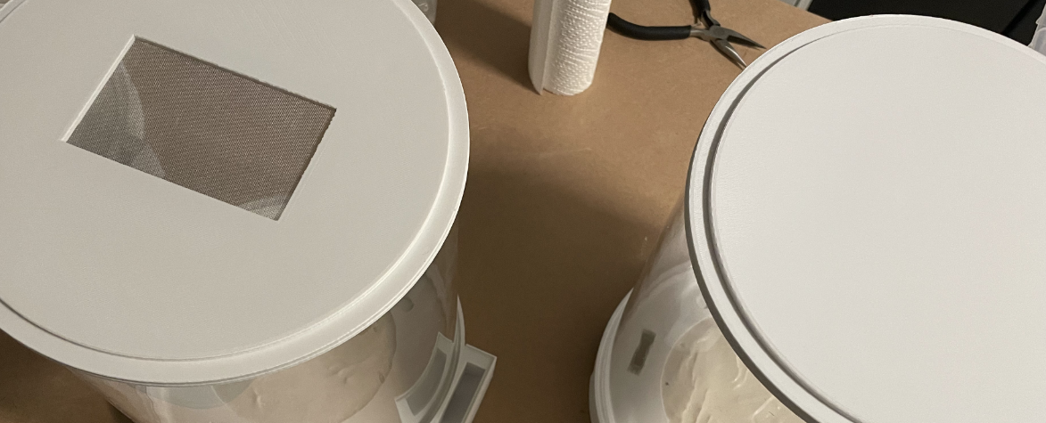 Gedruckt ist das ganze mit ABS aus Deutschland. Das andere Druckmaterial war mir nicht ausreichend genug. Es gibt ein Wassertank den man von außen befüllen kann welcher dann das innere befeuchtet. Es gibt noch eine kleine Plattform mit Schlitzen damit der Pilz nicht in direktem Kontakt zu dem "Plaster" kommt welcher die Feuchtigkeit speichert. Ich habe noch ein kleinen Lüftungsschlitz im Boden welches mit einem Edelstahldraht verschlossen / "verklebt" wurde. Der Deckel besteht aus zwei Teilen.