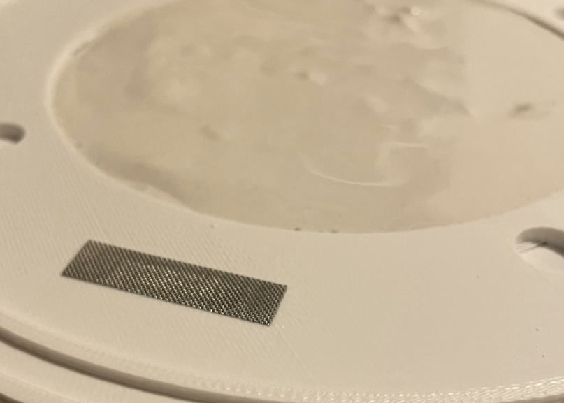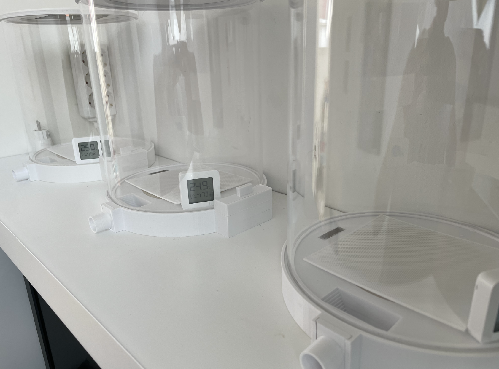 Gedruckt ist das ganze mit ABS aus Deutschland. Das andere Druckmaterial war mir nicht ausreichend genug. Es gibt ein Wassertank den man von außen befüllen kann welcher dann das innere befeuchtet. Es gibt noch eine kleine Plattform mit Schlitzen damit der Pilz nicht in direktem Kontakt zu dem "Plaster" kommt welcher die Feuchtigkeit speichert. Ich habe noch ein kleinen Lüftungsschlitz im Boden welches mit einem Edelstahldraht verschlossen / "verklebt" wurde. Der Deckel besteht aus zwei Teilen.