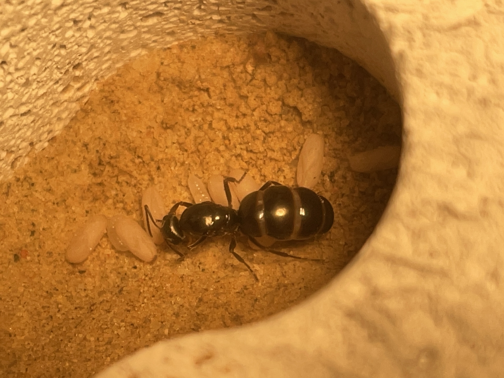 Habe ich seit gestern jetzt 3 Wochen bei mir zu Hause. Hab sie einfach fast achtlos in ein Ytongnest gesetzt, etwas Honig und Wasser abseits der abgedunkelten Nestkammer zur Verfügung gestellt. Und jetzt das … 🫣 … 8 kleine