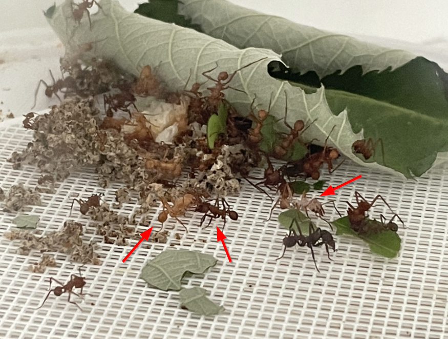 Aktuell hoffe ich tatsächlich das es die Kolonie schafft da wir inzwischen bei 8 Toten sind aber Sie haben Ihren Pilz nun zusammen gelegt und haben nur noch einen welchen Sie unter dem Blatt bauen. Habe heute auch mal das Müllbecken abgesaugt und im Futterbecken auch den Müll entsorgt. Irgendwie haben Sie die Toten im Futterbecken gelagert.