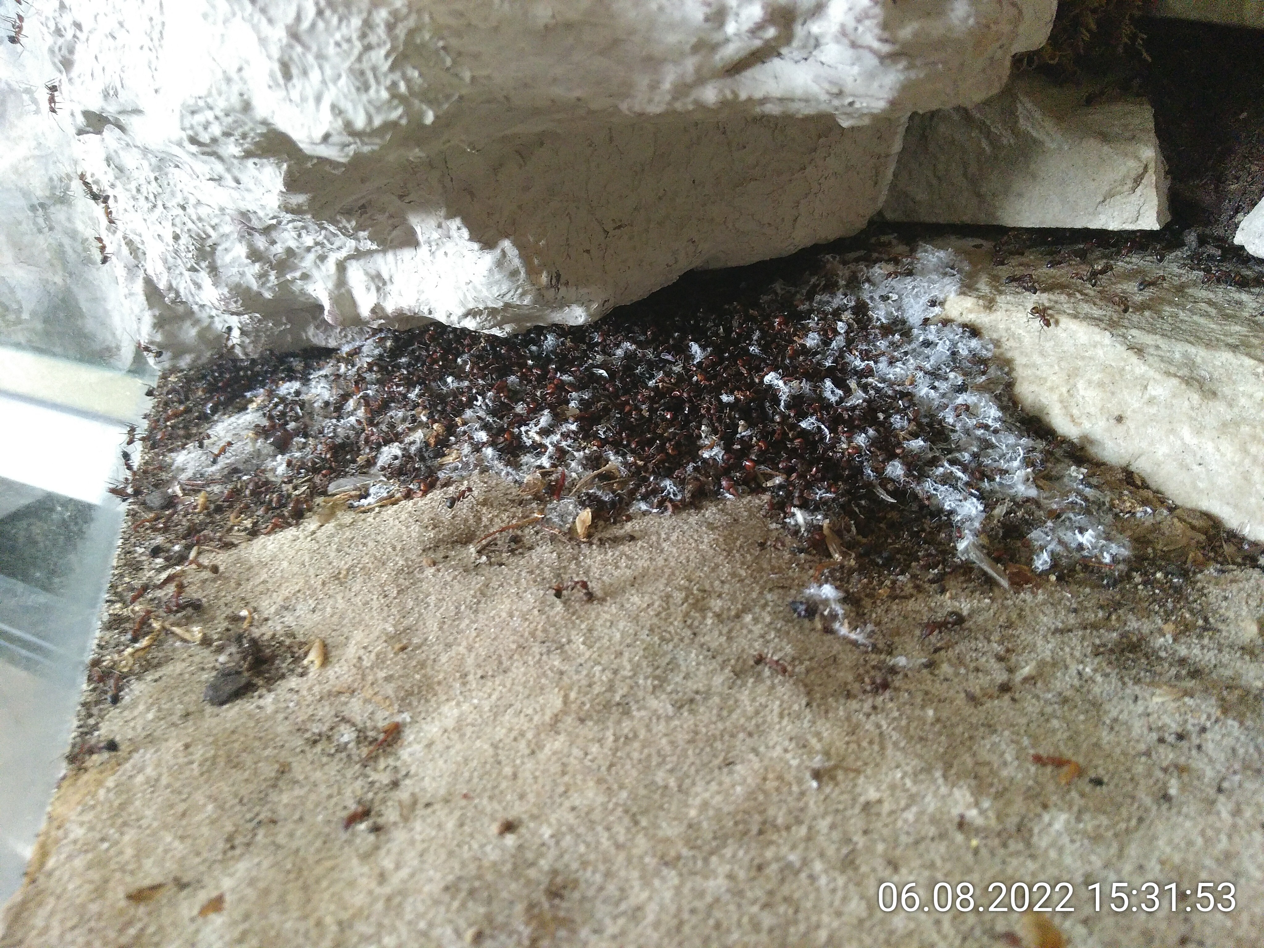 Neben dem Feuerzeug liegen die in Watte versponnenen Leichen, daneben ist die Basis des Haufens zu sehen. Wer mal sehen will, was so auf einem Ameisenfriedhof landet, sollte sich die nächsten Bilder genauer anschauen.