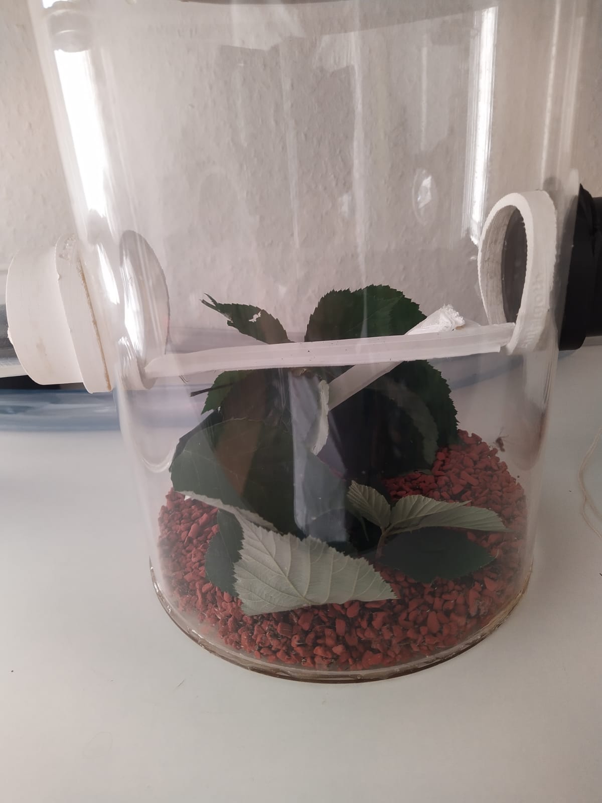 Im Müllbecken ist eine dünne Schicht Terrariensand. Mit einem kabelgebundenem Hygrometer und Thermometer (wollte keine Strahlung bei den Ameisen riskieren) messe ich die Umgebung im Pilzbecken. Ich halte die Temperatur bei 25-27° und die Luftfeuchtigkeit zwischen 90-95%.