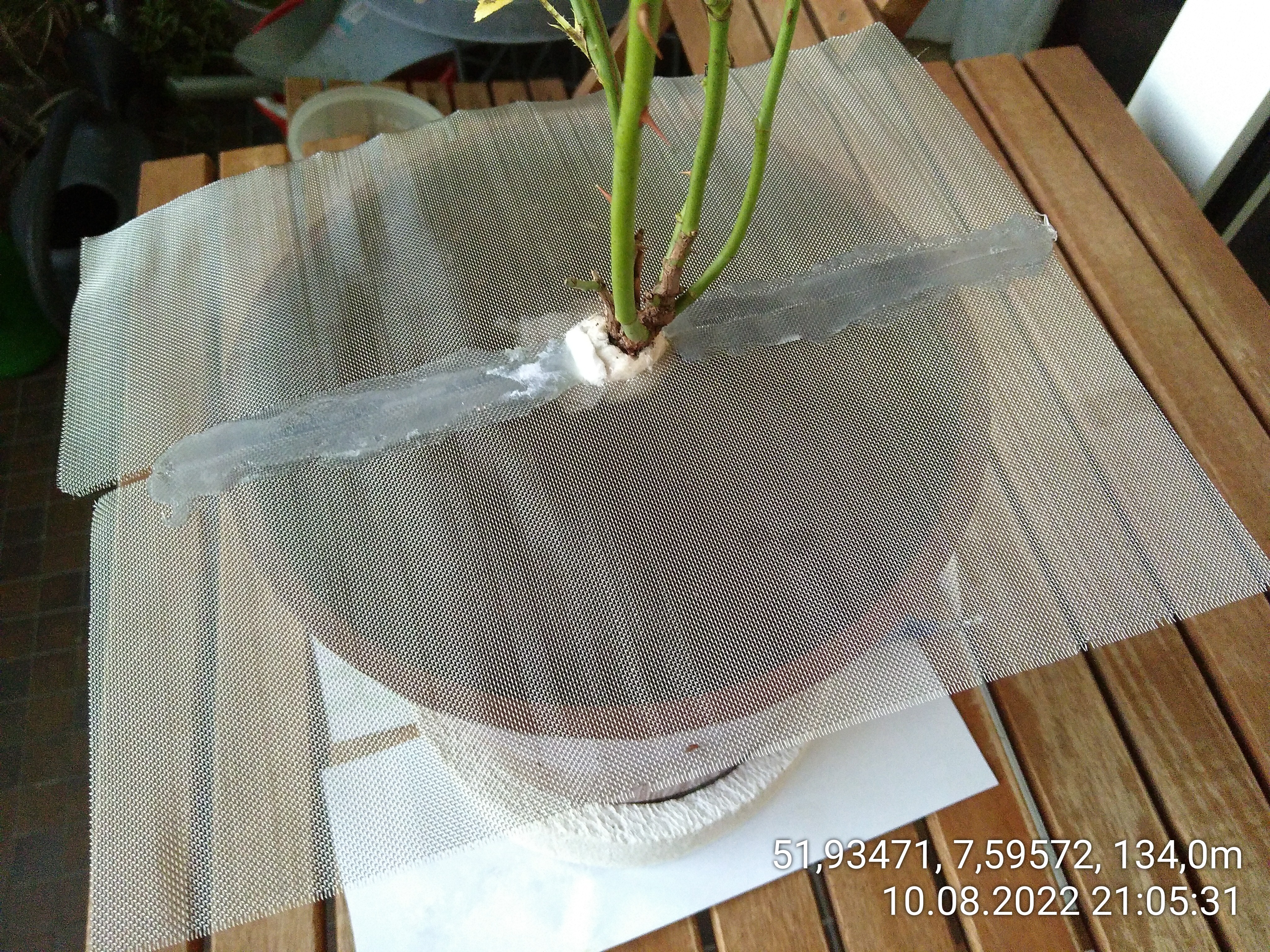 Morgen werde ich dann den Draht noch mit Silikon am Topf fixieren und den Überstand abschneiden. Da kommt nichts mehr durch außer Luft. Und das ist bestimmt gut für die Rose.