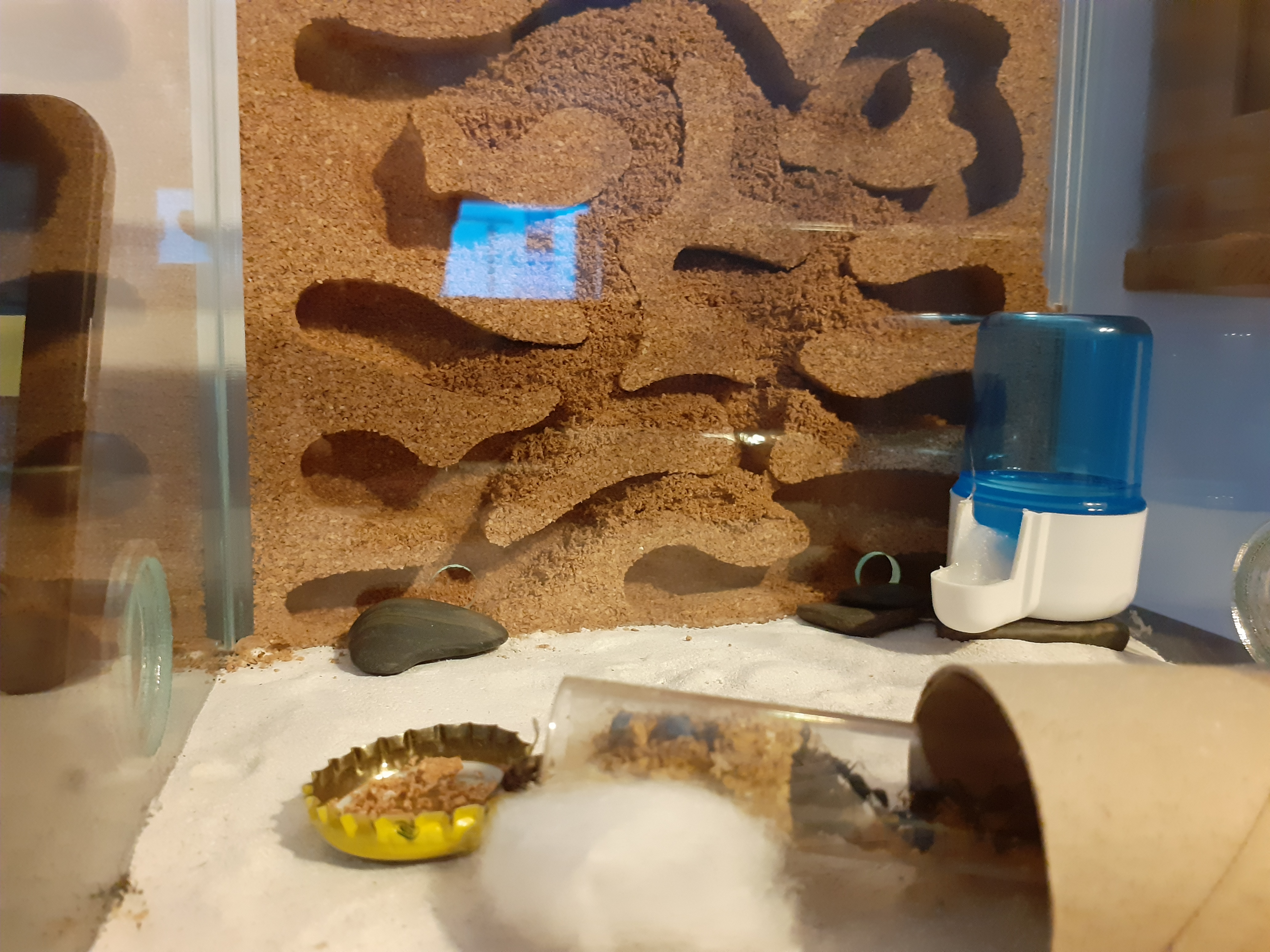 der Umzug ist abgeschlossen und meine Ameisen bewohnen aktiv ihr neues zu Hause. Gelegentlich stoßen sie auf noch mit Korkmehl blockierte Bereiche und "graben" dort etwas. Seit sie nicht mehr im Neströhrchen sind, sieht man sie auch häufiger an der Wassertränke. Leider hatte ich auch schon wieder zwei Verluste. Sie zählten beide zu den kleinsten Ameisen und ich gehe daher davon aus, dass es sich um Pygmäen handelte. Damit wären sie etwa jeweils ein Jahr alt geworden...