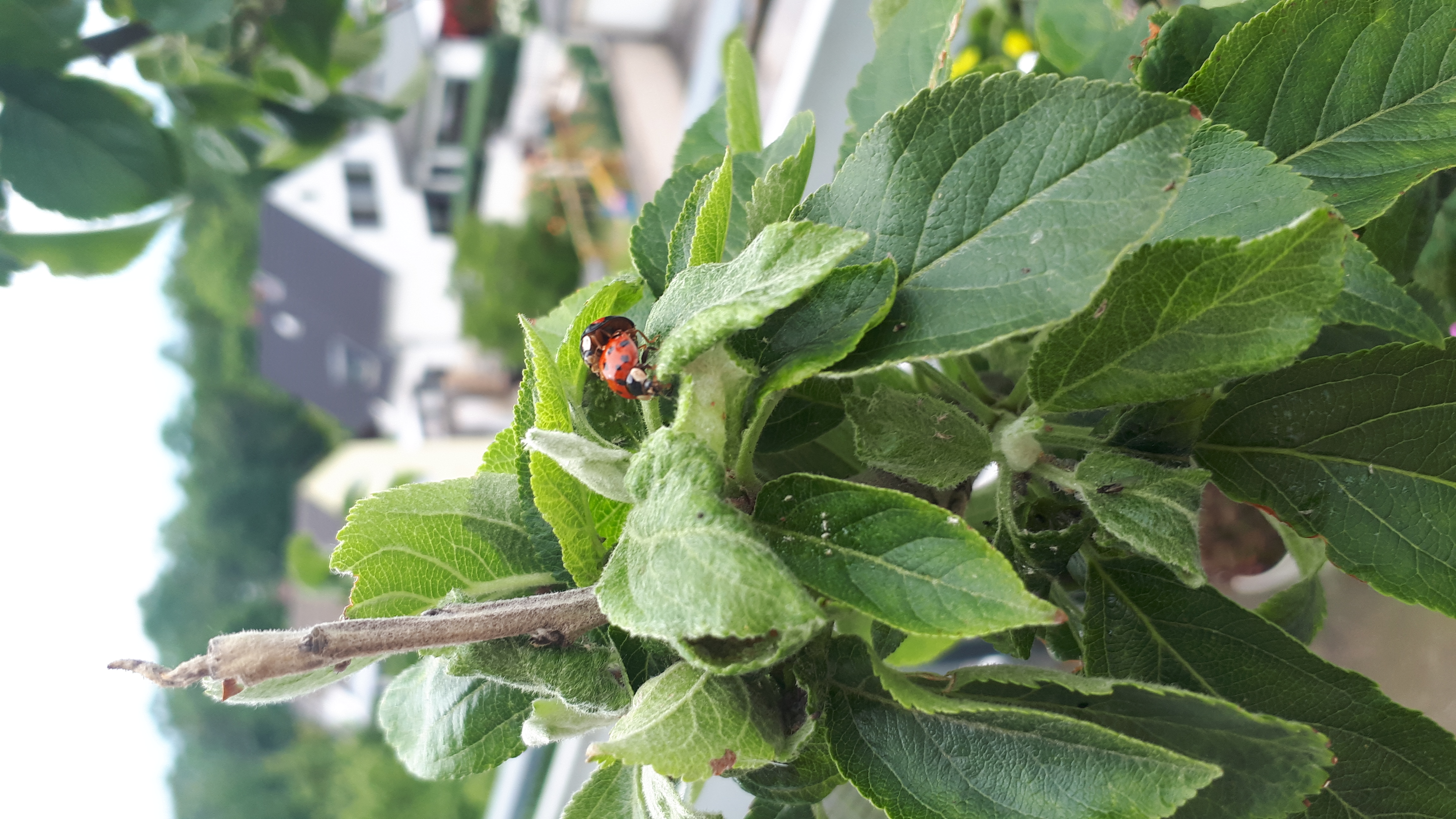 Ich war hin und her gerissen. Ich habe erstmals kleine Äpfel daran und möchte den Baum nicht schwächen. Immer Wasser im Übertopf stehen zu haben, gelang mir nicht. Insektengift wollte ich nicht. Nun habe ich Helfer bekommen. Ein Marienkäfergelege habe ich auch schon entdeckt!