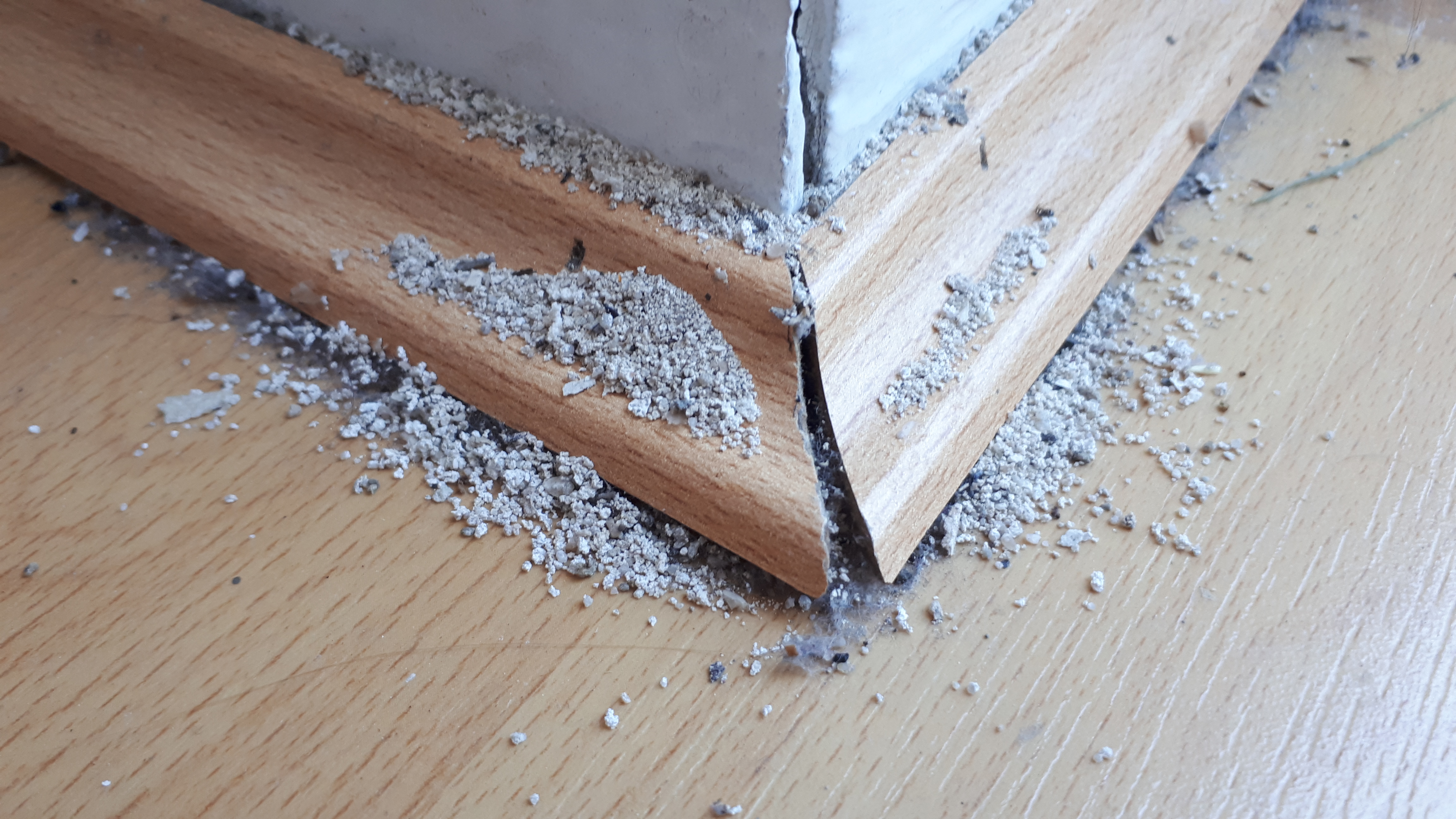 Kürzlich begannen sie immer mehr Auswurf unter der Fußleiste hervor zu befördern. Das Material ist das der Wand.