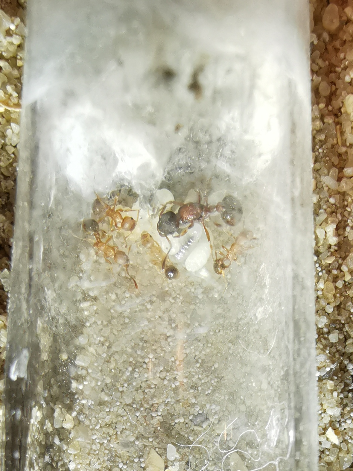 Bei der Myrmica ist es noch nicht ganz klar, aber sie scheint mir recht ruhig zu sein. Das Reagenzglas ist natürlich für beide Arten eine eigentlich zu große Gründungskammer, wird aber in der Regel trotzdem angenommen.