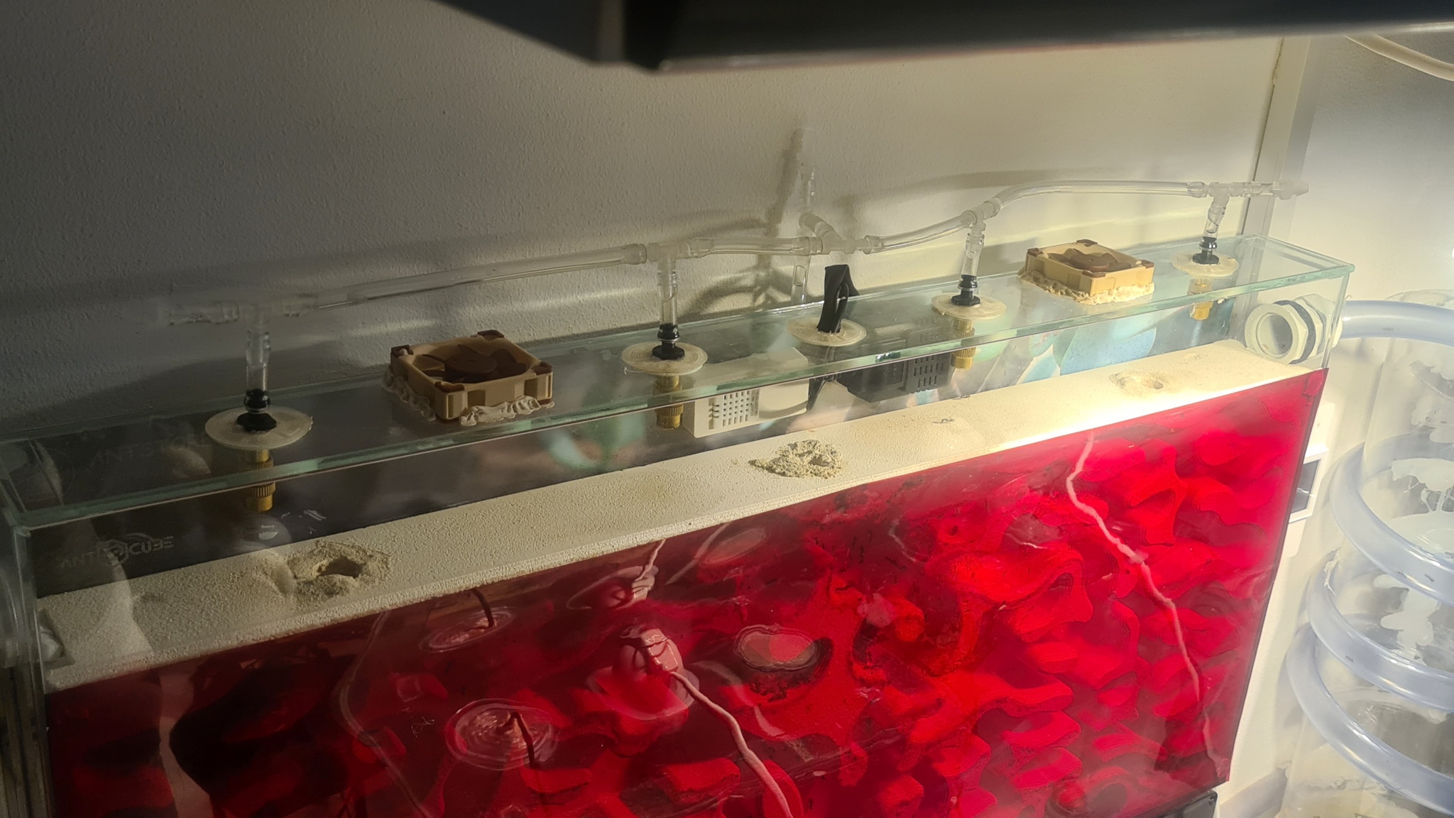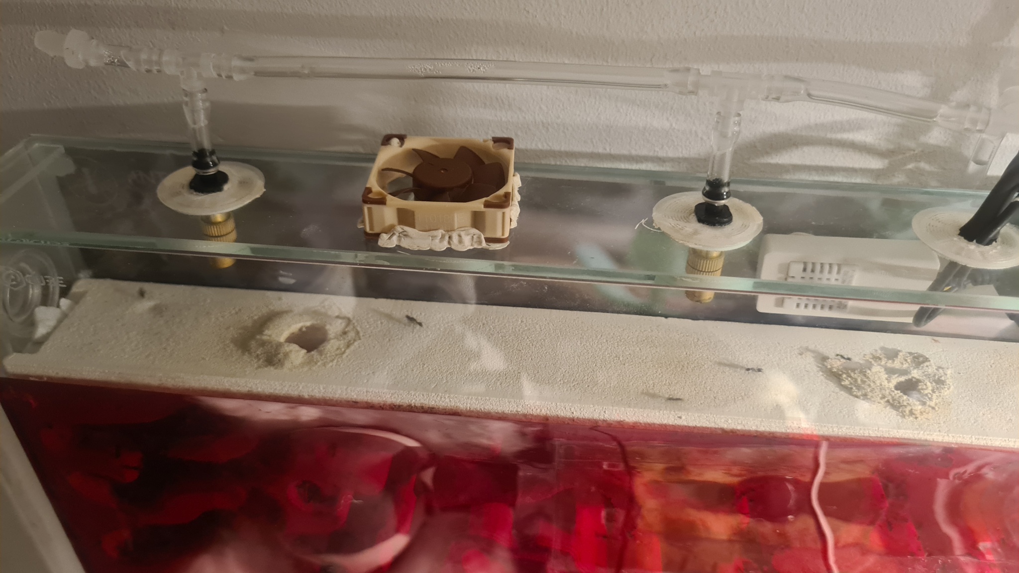 Damit ich das ganze befeuchten kann, habe ich mir vom Antstore in den Glasdeckel 7x27mm Löcher machen lassen, in 4 dieser Löcher habe ich Wassersprühnebler eingebaut die über einen simplen Bewässerungscomputer für Topfpflanzen das Wasser auf die Oberfläche des Gipsnestes besprühen... Das ich es mit der Feuchte ein bisschen zugut gemeint habe ist mir klar, sonst würde das Gipsnest jetzt auch nicht schimmeln :)