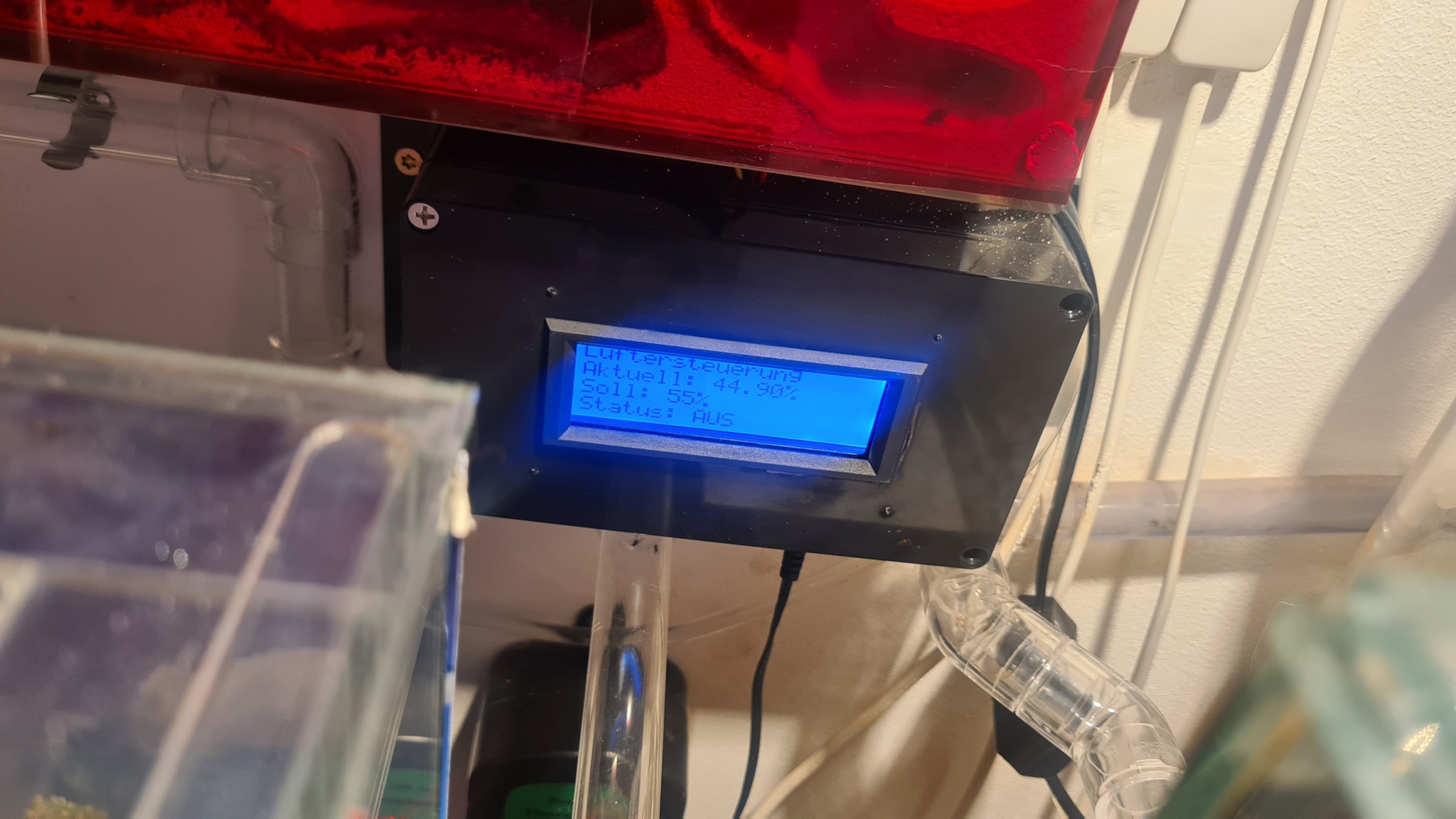 Jap so ist es, ich habe unten nochmal ein Foto angehängt ("Glasfarm") ist genau das gleiche, ich habe mir nur noch Aluprofile zuschneiden lassen, die mit Epoxidharz festgeklebt damit ich das ganze and die Wand befestigen kann ... Die Glasfarm hat oben einen leicht abnehmbaren Glasdeckel, wie ich schon im ersten Beitrag erwähnt habe mit 7x - 27mm Bohrungen, von den 7x - 27mm Löchern sind 4 mit den den Sprühneblern versehen. Auf 2 befinden sich 40mm Noctua Pc-Lüfter (siehe Bild "Lüfter") Durch die letzte 27mm Öffnung gehen 2 Sensoren durch wie auf dem Bild "Sensoren" zu sehen ist. Ich möchte jetzt gar nicht darauf groß eingehen warum es zwei Sensoren sind... Bald ist es nur mehr einer der alles regelt/anzeigt so wie ich das möchte ...
