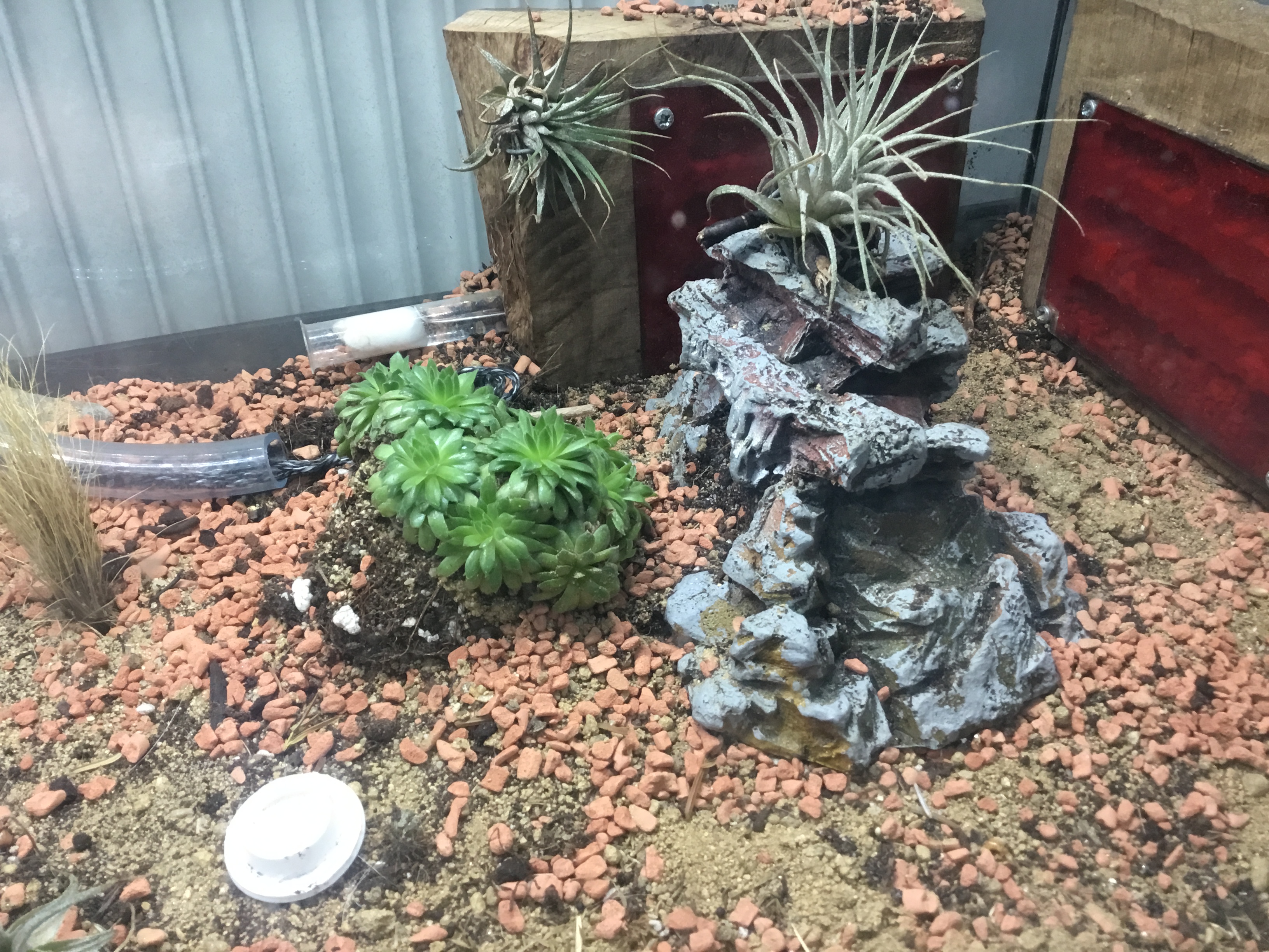 Nee, der hĂ€ngt da nicht einfach ungesichert, eine Sicherung sieht man, der schwarze Saugnapf (der nur dazu dient, die Öffnung an einem Ort zu halten) und hinter dem Terrarium mit 2 Kabelbinder am Tischchen befestigt (die eigentliche Verankerung), im grossen Terrarium hab ich ihn am Deckel befestigt. Deckel kommt beim 2. auch noch drauf, die Kerbe ist schon rein geschnitten, das gibt auch noch Halt :)