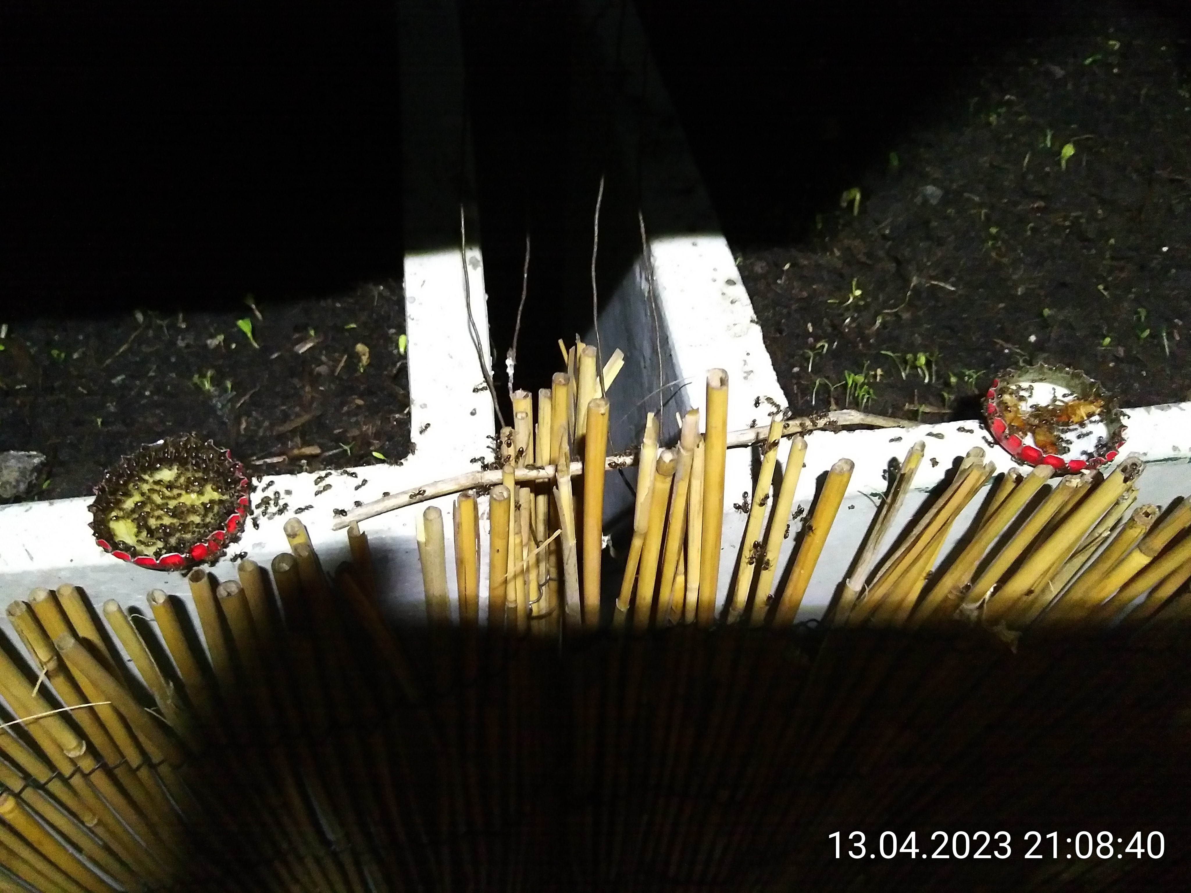 Das Schwärmen ist eigentlich vorbei. MIttags herrscht zwar immer noch Unruhe, aber schon lange nicht mehr so ausgeprägt wie im Winter. Ich hoffe, das höngt zumindest auch ein bisschen mit meinen Antsaugungen zusammen. Ich merke seit ein paar Monaten, dass sie deutlich weniger fressen, sowohl Insekten als auch Süßes. Gerade beim Süßen macht es Sinn, wenn Tausende Verbraucher auswandern. Und auch die hoffentlich natürliche Sterbewelle hält an. Der Friedhof wächst kontinuierlich. Bei Insekten lässt das auf wenig Brut deuten. Nesteinsicht habe ich ja kaum, aber manchmal zeigen sie mir trotzdem etwas.