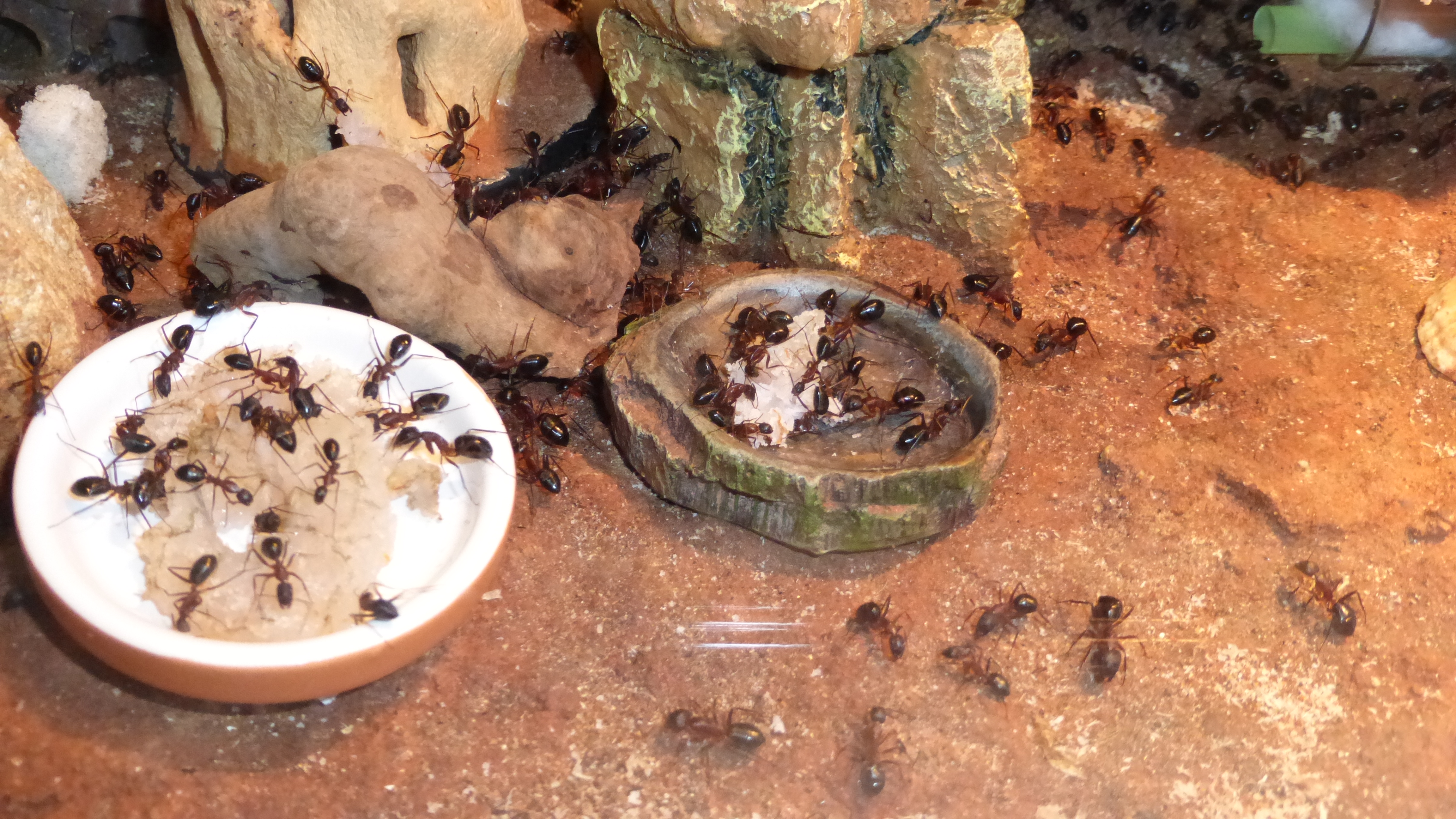 Viel ist nicht los, sie sind recht inaktiv und essen/trinken nicht viel. FĂĽr den kleinen Zuckerspender hier im Becken brauchen sie 3-4 Tage.
