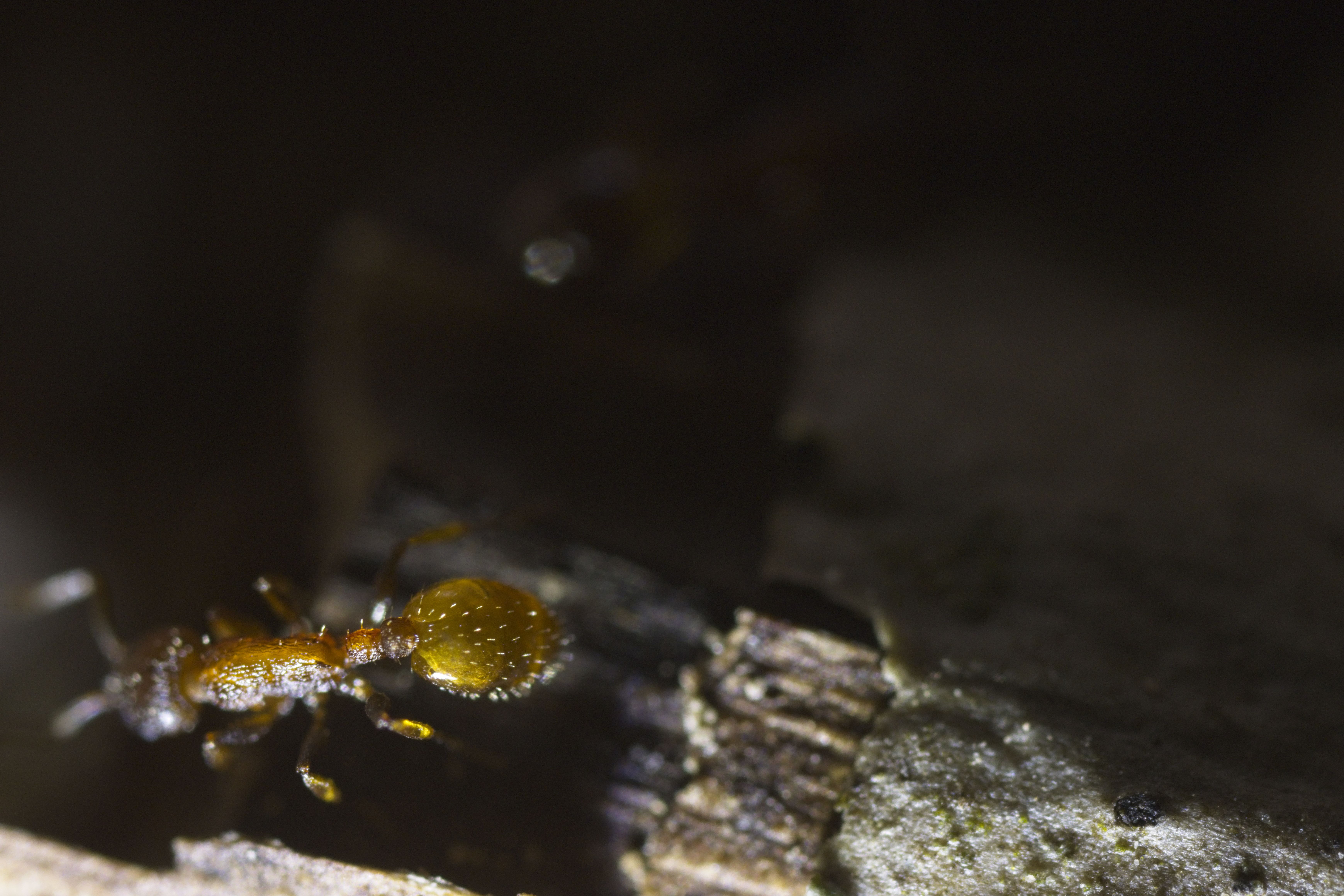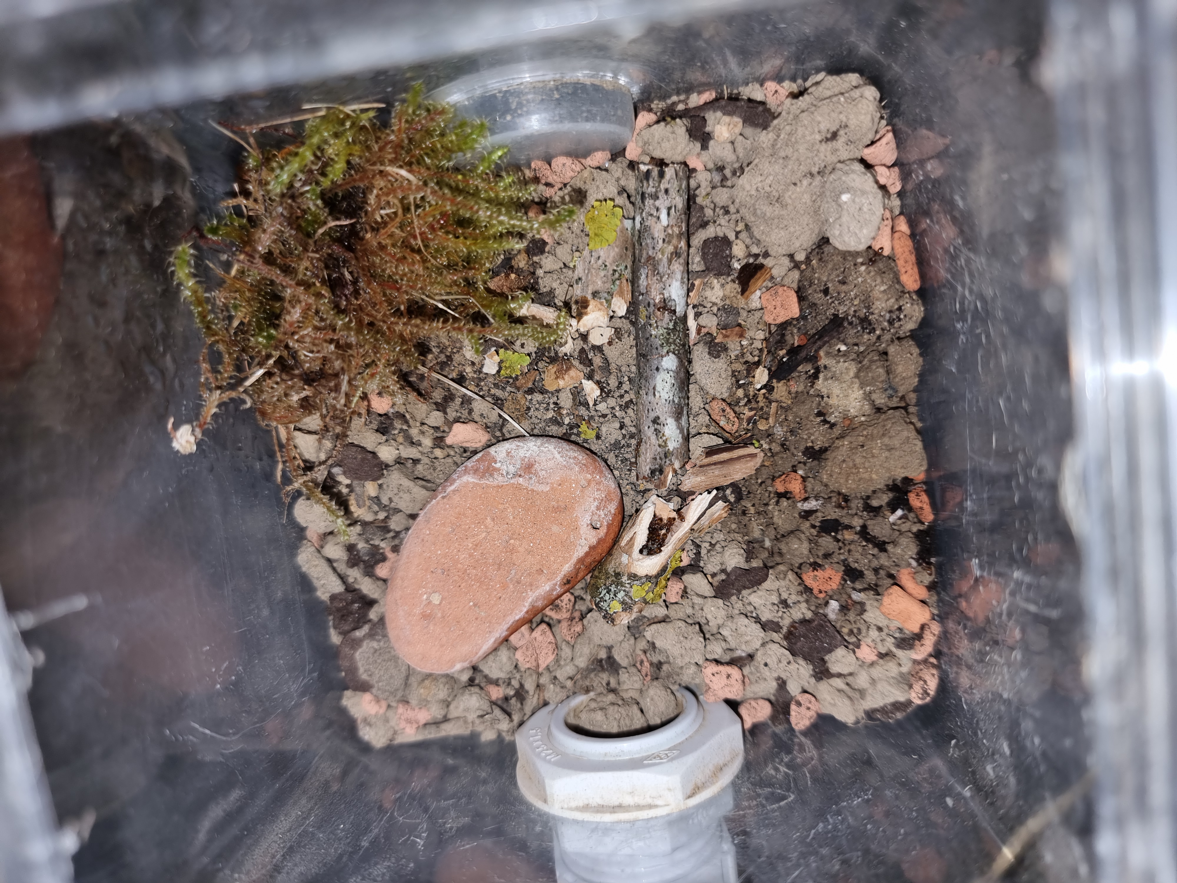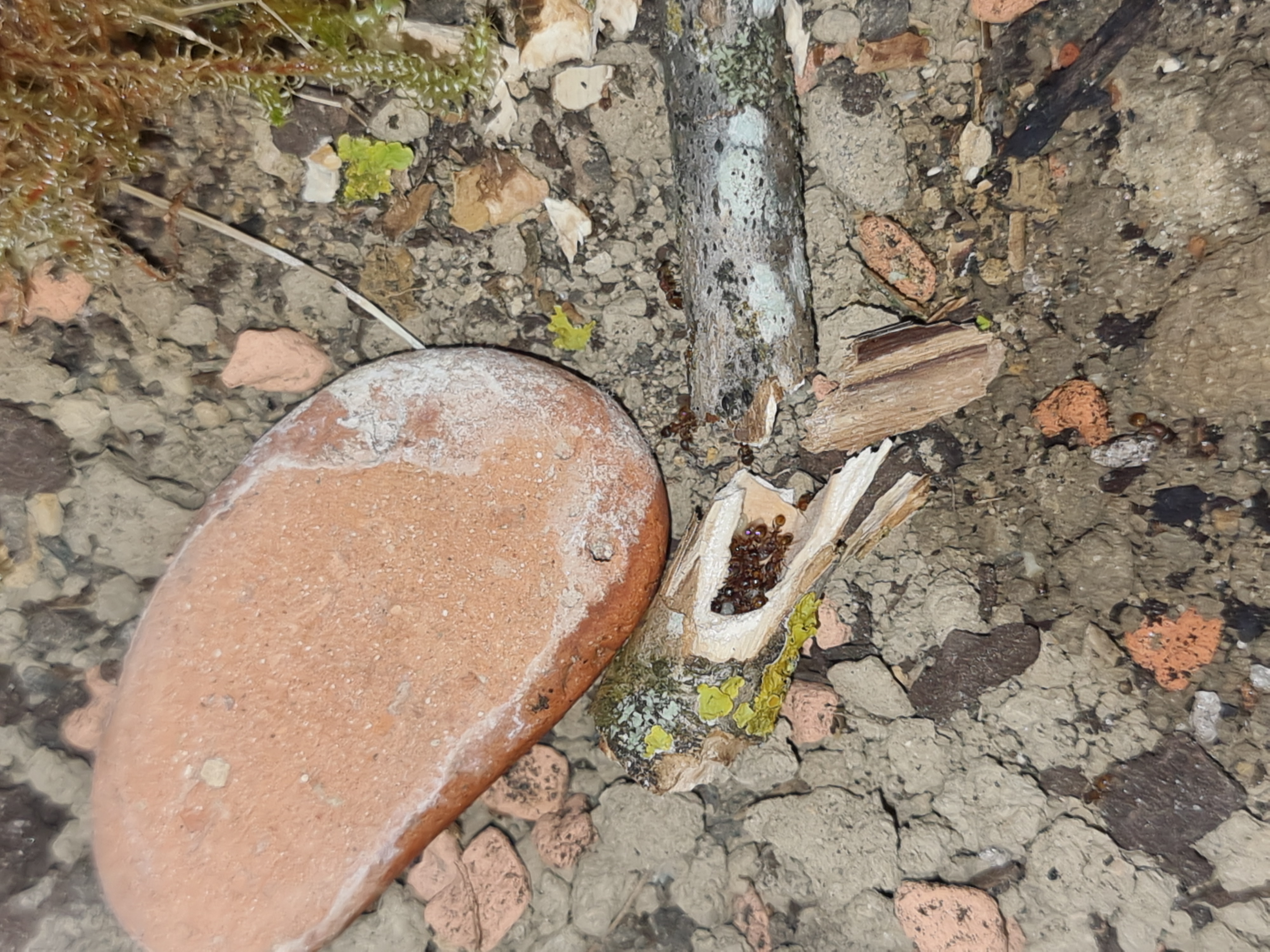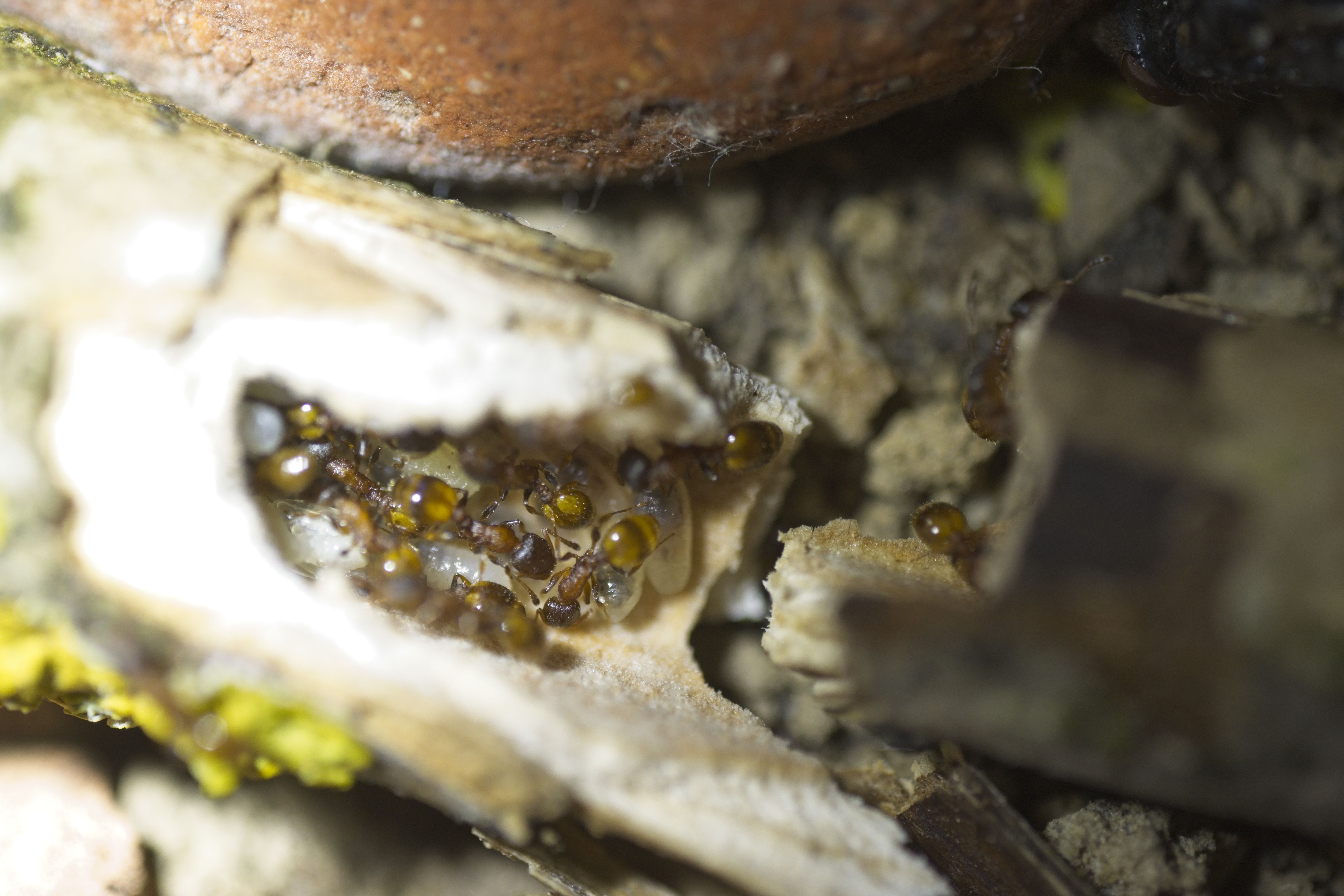 Er kam mit einem kleinen, alten, zerbrochenen Ast zu mir und meinte, da würden winzige rote Ameisen rein und raus gehen. Tatsächlich waren am einen Ende ganz viele kleine Ameisen zu sehen und sogar Eier. Ich hab den Ast in einen Behälter gelegt und eine Weile beobachtet, als ich zu meinem erstaunen sah wie eine Arbeiterin plötzlich eine wesentlich längere, dunklere Ameise in ihren Kiefern von einem Ast, in den anderen transportiert hatte. Kurz im netzt nachgeschaut wie die