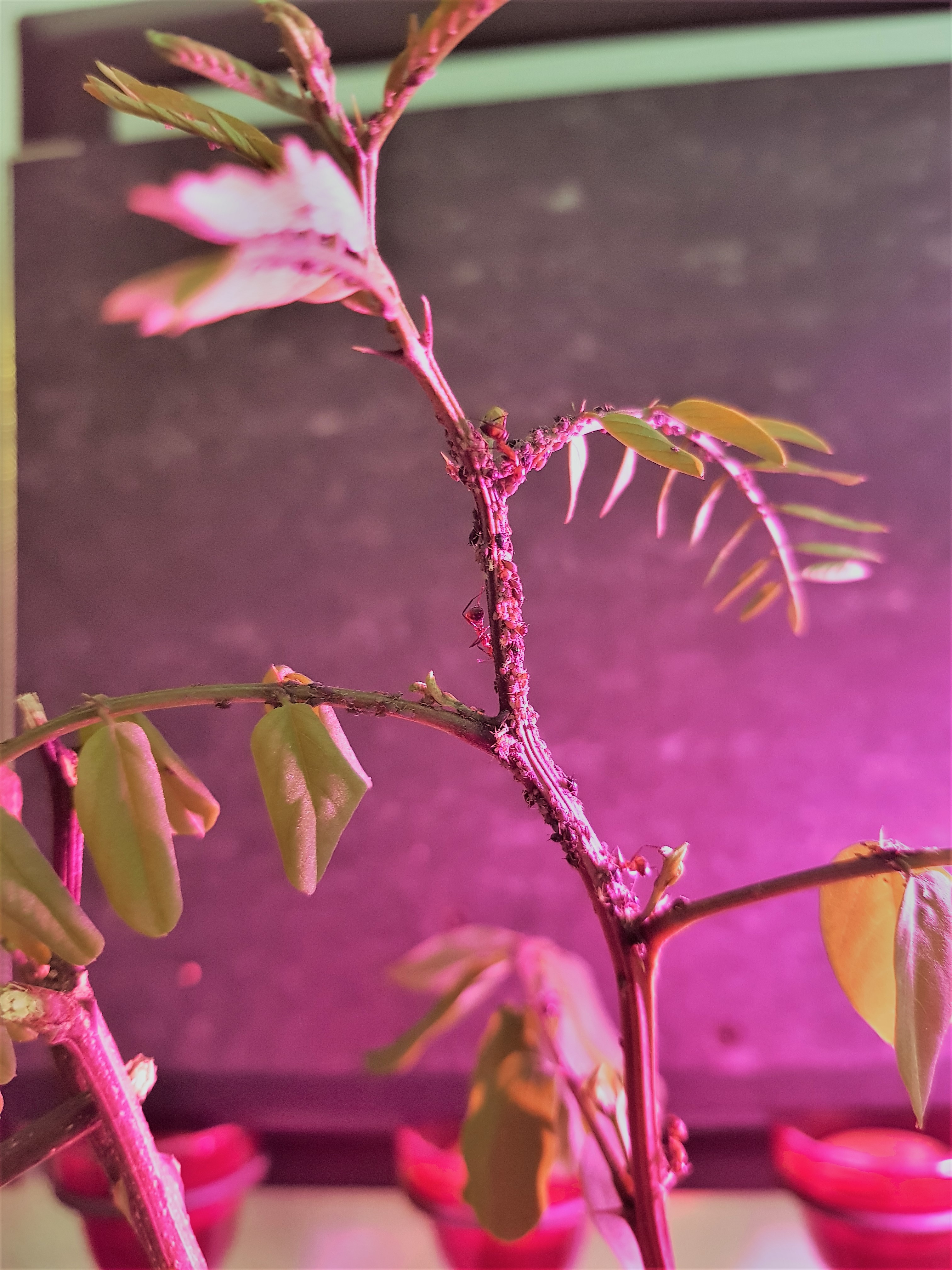 Ab 100+ LĂ€usen (eine gute sichtbare, mehrere Zentimeter lange Lauskolonie oder Traube) ist es ein guter Zeitpunkt, die Pflanze den Ameisen zugĂ€nglich zu machen. Die aktuelle Robinie der nicobarensis wird durch eine Pflanzenlampe versorgt, hĂ€lt bisher stabil durch und zeigt Wachstum an mehreren Trieben, wenn auch recht langsam. Bei einer gesunden Robinie kann man mit einem Wachstum von 10cm pro Monat rechnen, aber eine im Zimmer gehaltene und mit LĂ€usen befallene Pflanze wĂ€chst natĂŒrlich langsamer - was uns Haltern sehr zugute kommt.