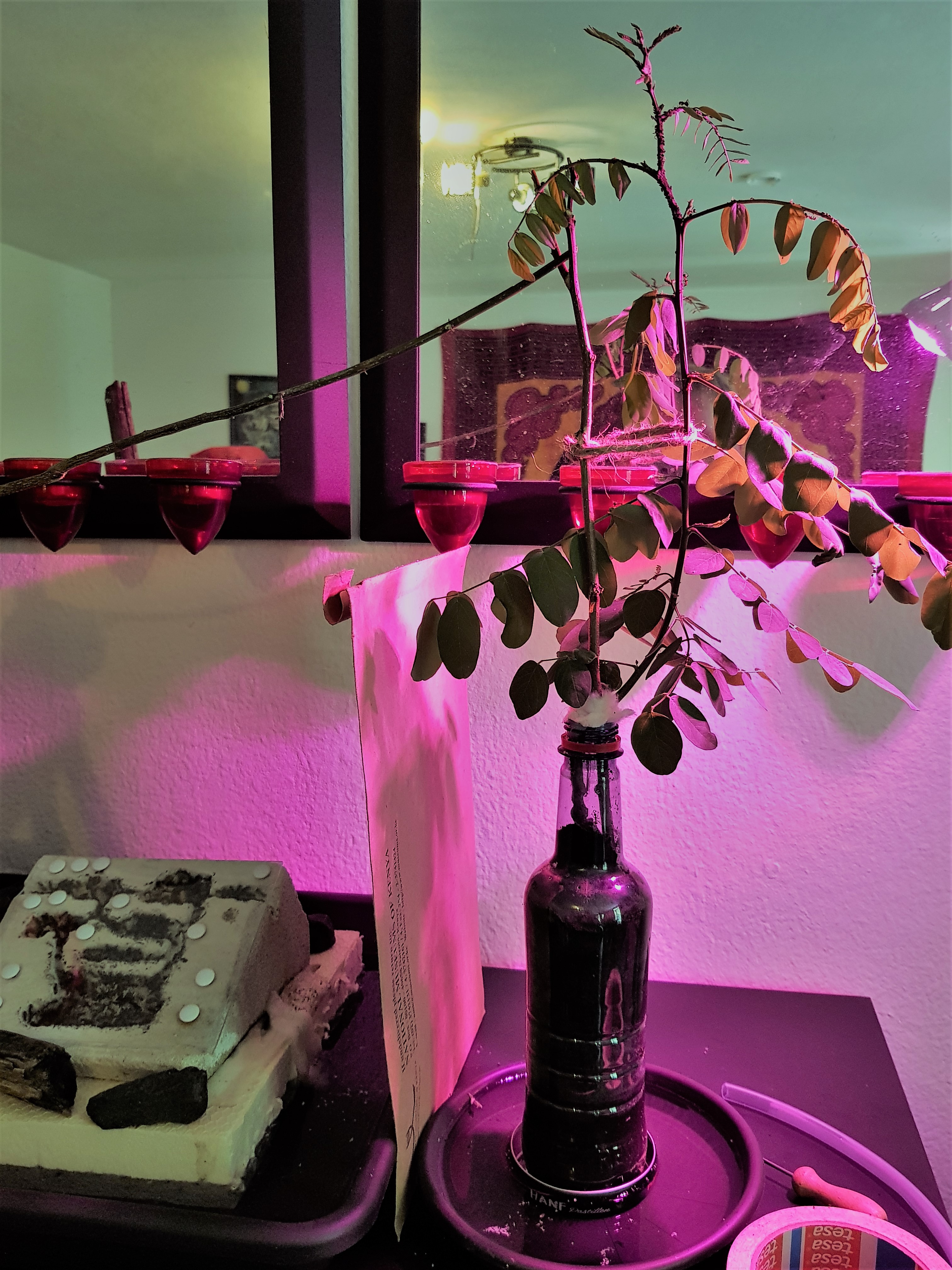 Hier ist eine etwas grĂ¶ĂŸere 20cm hohe Robinie, auf dieselbe Weise prĂ€pariert. LĂ€use wurden bereits darauf angesiedelt, doch bevor diese Pflanze einer Ameisenkolonie verfĂŒgbar gemacht werden kann, muss die Lauskolonie erst noch wachsen.