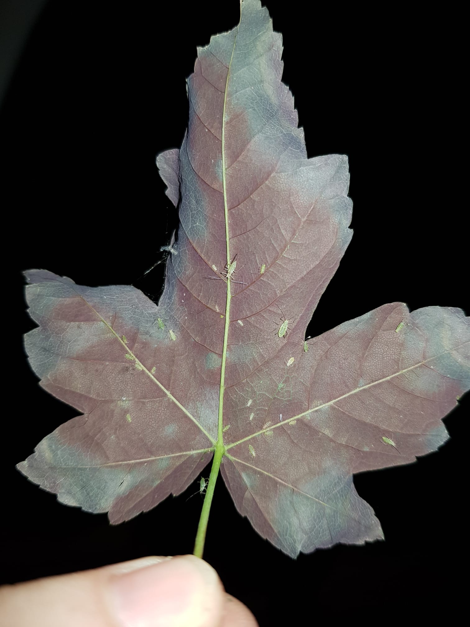 Einige geflĂŒgelte LĂ€use fanden an einem der Ahorns gefallen und haben sich unter einem Blatt an einer Ader niedergelassen.