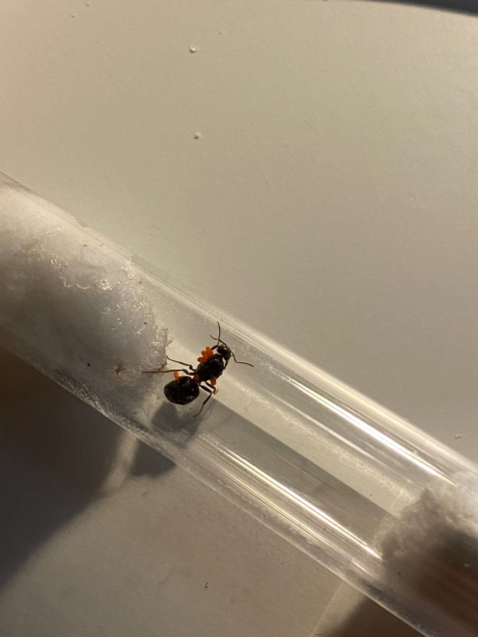 habe die Folgenden Ameisenköniginnen im Garten gefunden. Zwei davon haben rote Kugelchen auf dem Körper. Von 6 am selben Tag gefangenen Königinnen sind sie die einzigen beiden, die bisher noch keine Eier gelegt haben.