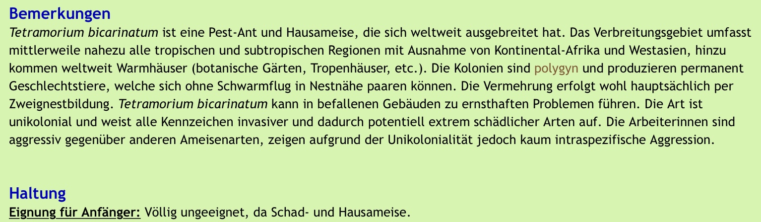Alles in allem sind Lasius niger quasi die Tetramorium bicarinatum Zentraleuropas, nur mit der Ausnahme das sie mongyn sind und sich im Falle eines (ziemlich wahrscheinlichen) Ausbruchs nicht in deiner Wohnung festsetzen und dich mehrere Tausend Euro für den Kammerjäger (sowie das Ansehen bei all deinen Nachbarn) kosten.