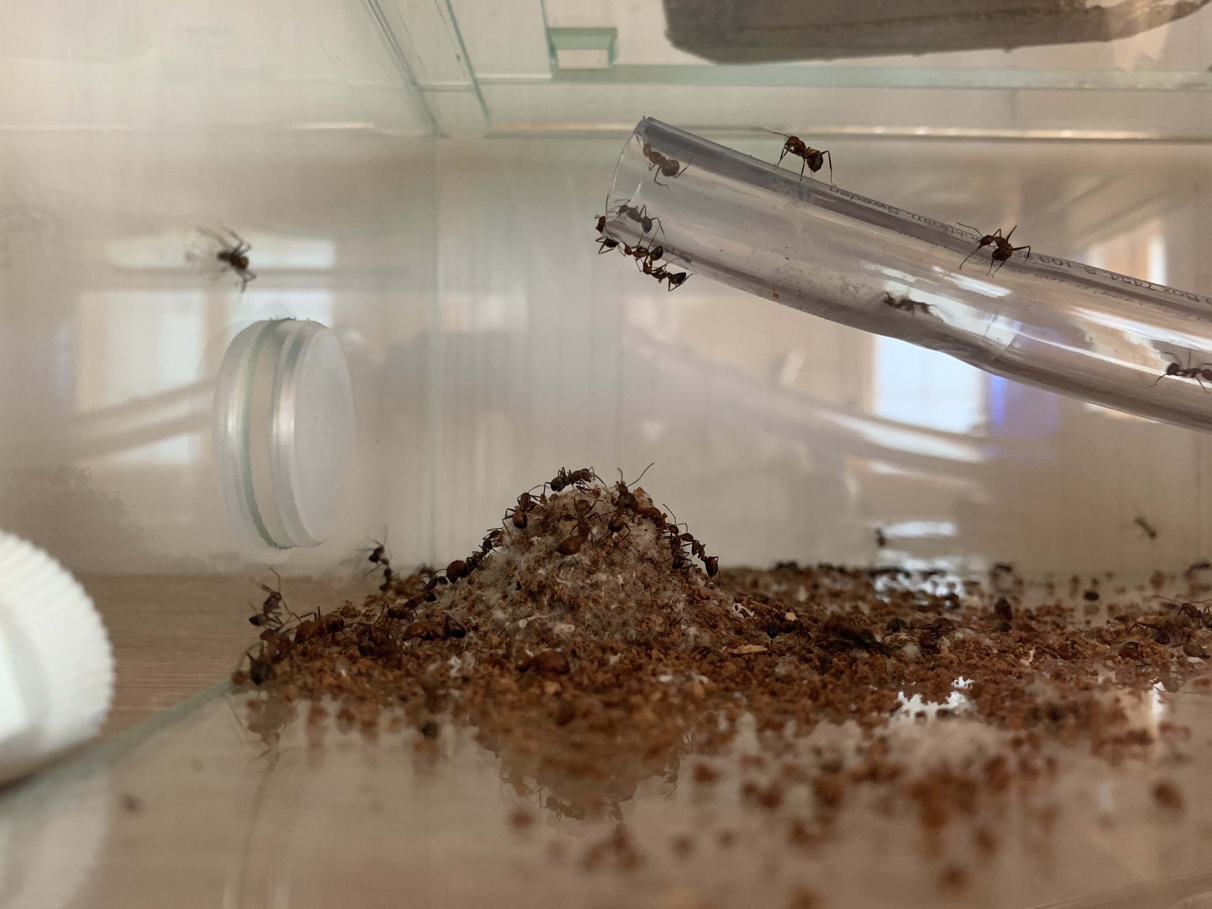 Ab und zu habe ich einen Blick zum Formicarium geworfen und habe da ein paar Ameisen rumlaufen sehen! Ok dachte ich, sind doch mehr in dem Flusenteppich gewesen als ich ursprünglich dachte! Ca. eine Stunde später als ich so im vorbeigehen neben die Arena schaute der große Schock (nein kein Horrorfilmmässiger Schock, finde nur gerade kein besseres Wort dafür)