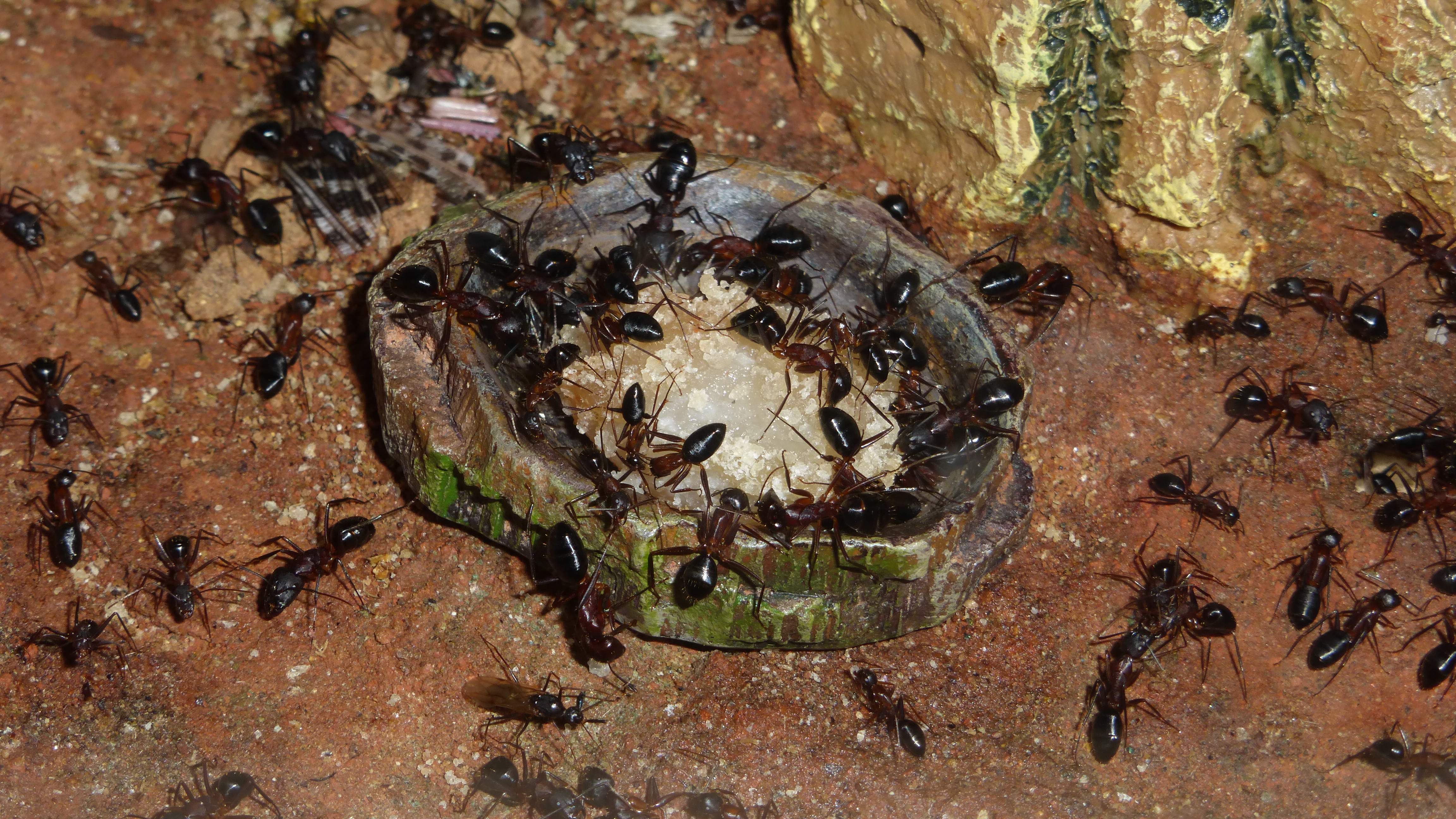 Camponotus nicobarensis zerlegen ihr Futter überwiegend in so kleine Stücke, das deren Transport ins Nest nicht richtig beobachtbar ist.