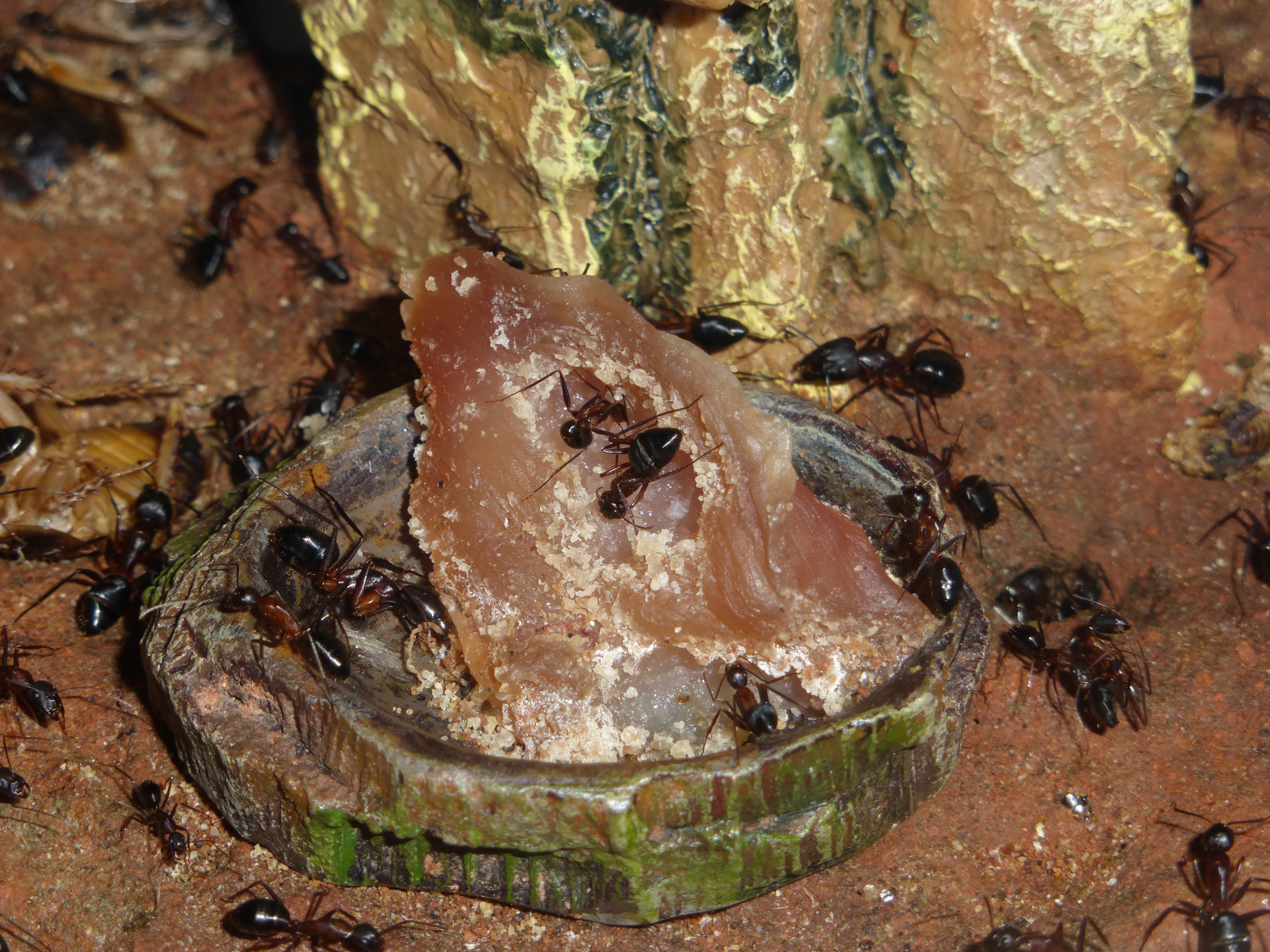 Auf den Bildern hier kann man das ganz gut sehen - das trockene Fleisch interessiert sie ĂŒberhaupt nicht, was sie wollen sind die Teile in denen sich noch Feuchtigkeit befindet. Gelegentlich werden auch StĂŒcke ins Nest transportiert, das kommt aber weniger oft vor, hauptsĂ€chlich wenn sie echt hungrig sind (lĂ€nger nichts bekommen haben) oder das Fleisch sehr zart ist und sich gut zerlegen lĂ€sst. Meine C. barbaricus transportieren grundlegend sehr wenig ins Nest, nur Fruchtfliegen, Maden und Fliegen werden gelegentlich eingetragen.