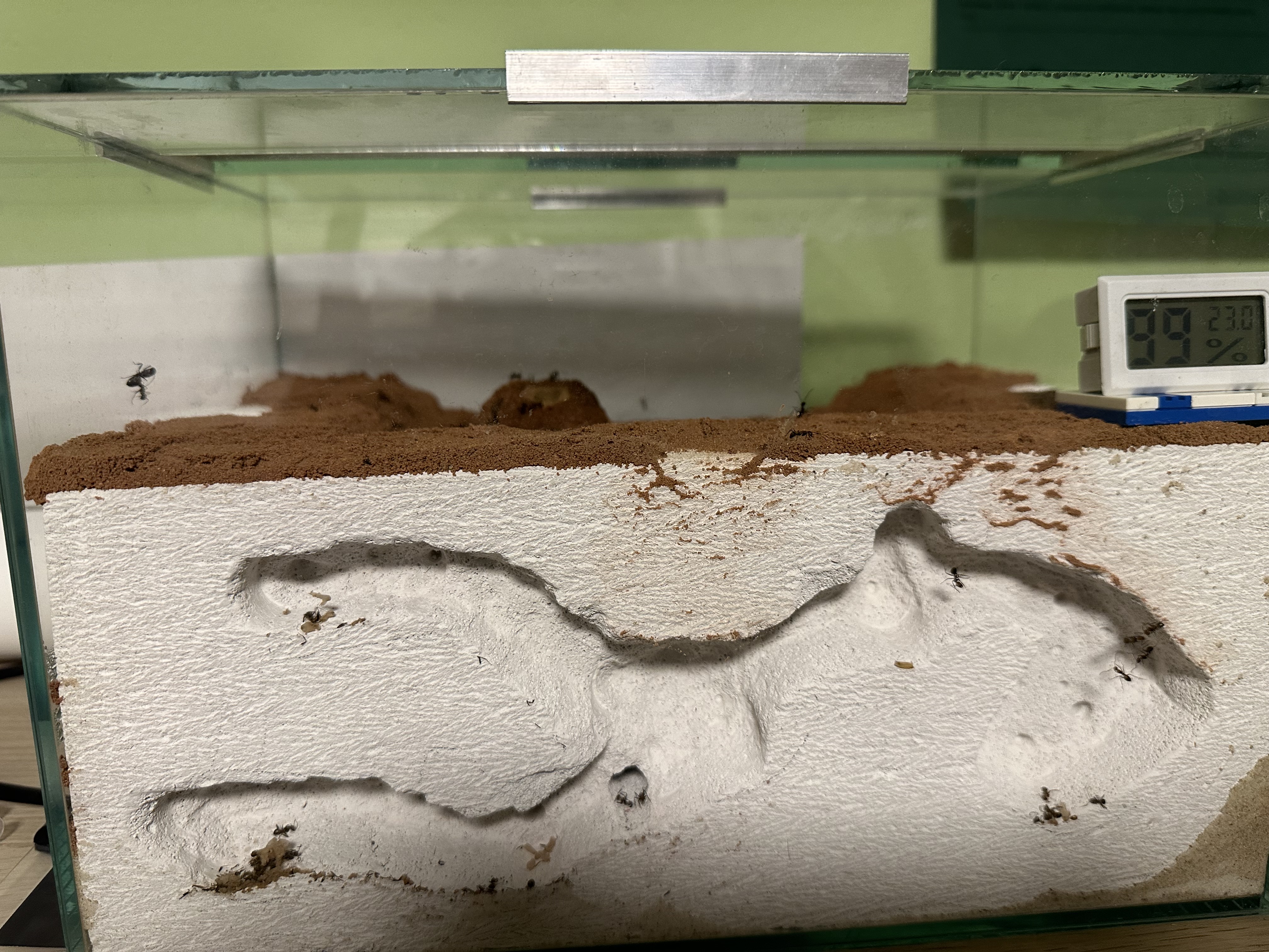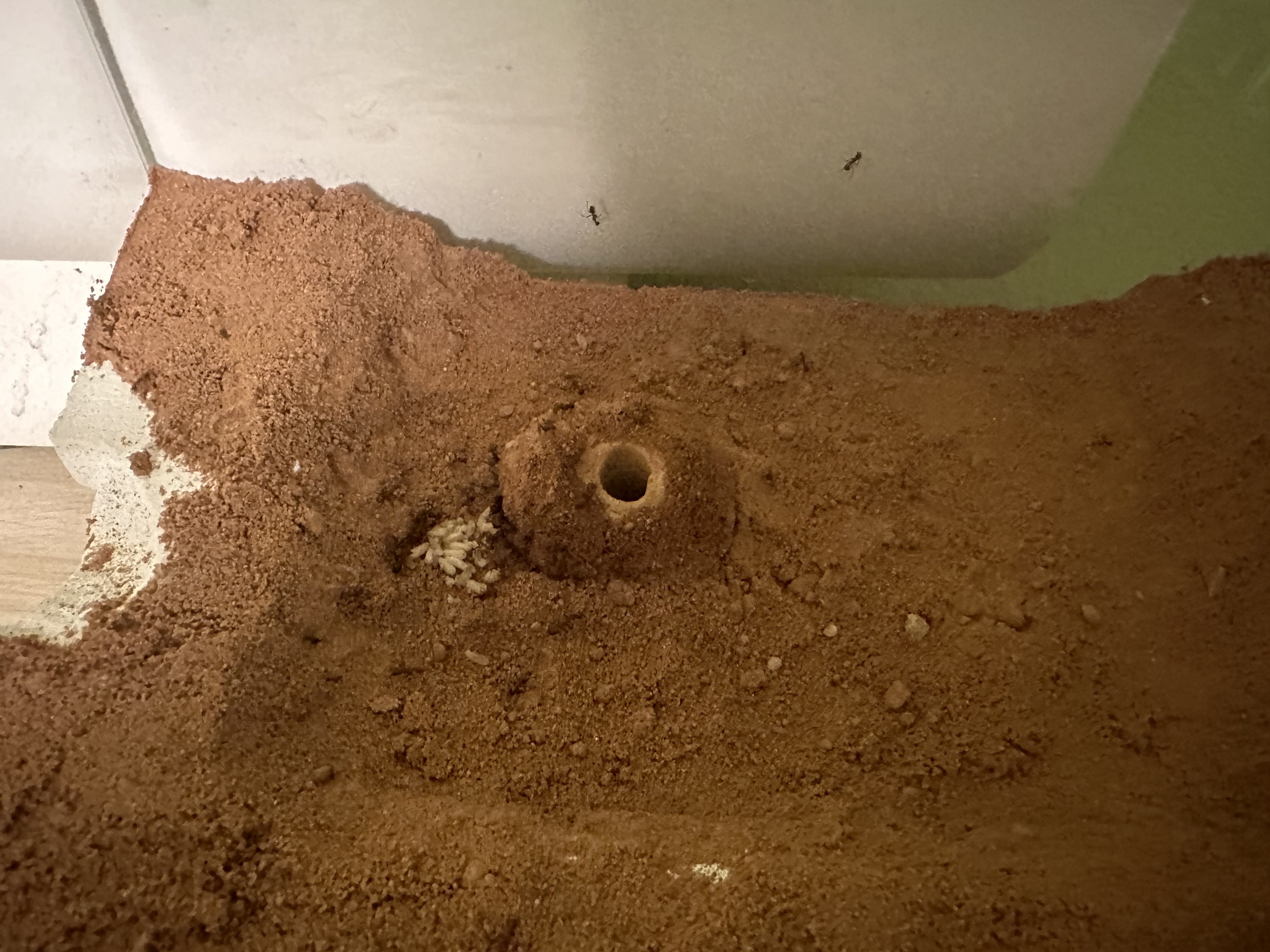 Ich habe vor ca. drei Monaten zwei Königinnen , einige Arbeiterinnen und Puppen gekauft. Die Kolonie hat sich im extra dafür gebauten Nest mit separater Arena super entwickelt/vermehrt. Seit wenigen Tagen sterben aber Ameisen und seit heute hat sich eine Königin samt Brut und Arbeiterinnen an die Oberfläche/Sand verschoben. Temperatur Nest 25 Grad, Arena 21 Grad, Luftfeuchtigkeit 70%. Nest Ytong, oberhalb Sand. Wenig Honig/Wasser getrunken, Dubias fleissig beknabbertert. Hat jemand eine Idee, aus das Problem sein könnte??