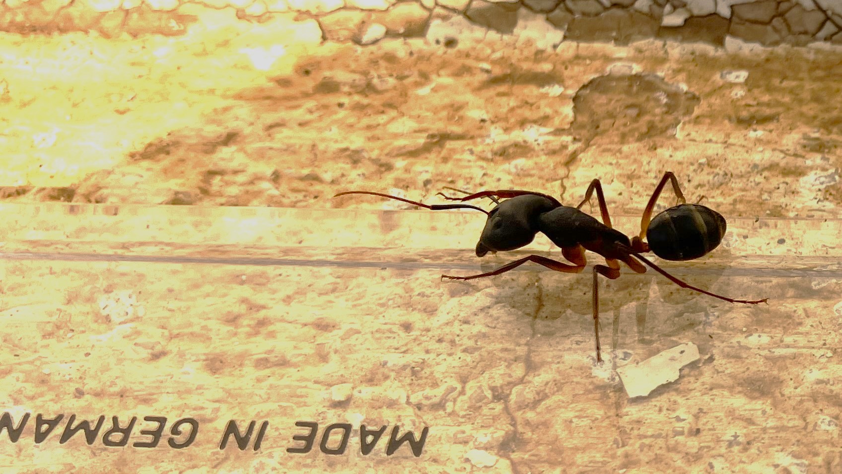 Dann habe ich versehentlich etwas Pepsi verschüttet und der Erstkontakt beschleunigte die Ameise als wäre es Raketen-Treibstoff. Es hat gar nicht lange gedauert , da waren es dann ca. 15 Tiere, die sich an der verdunstenden Lache gelabt haben.