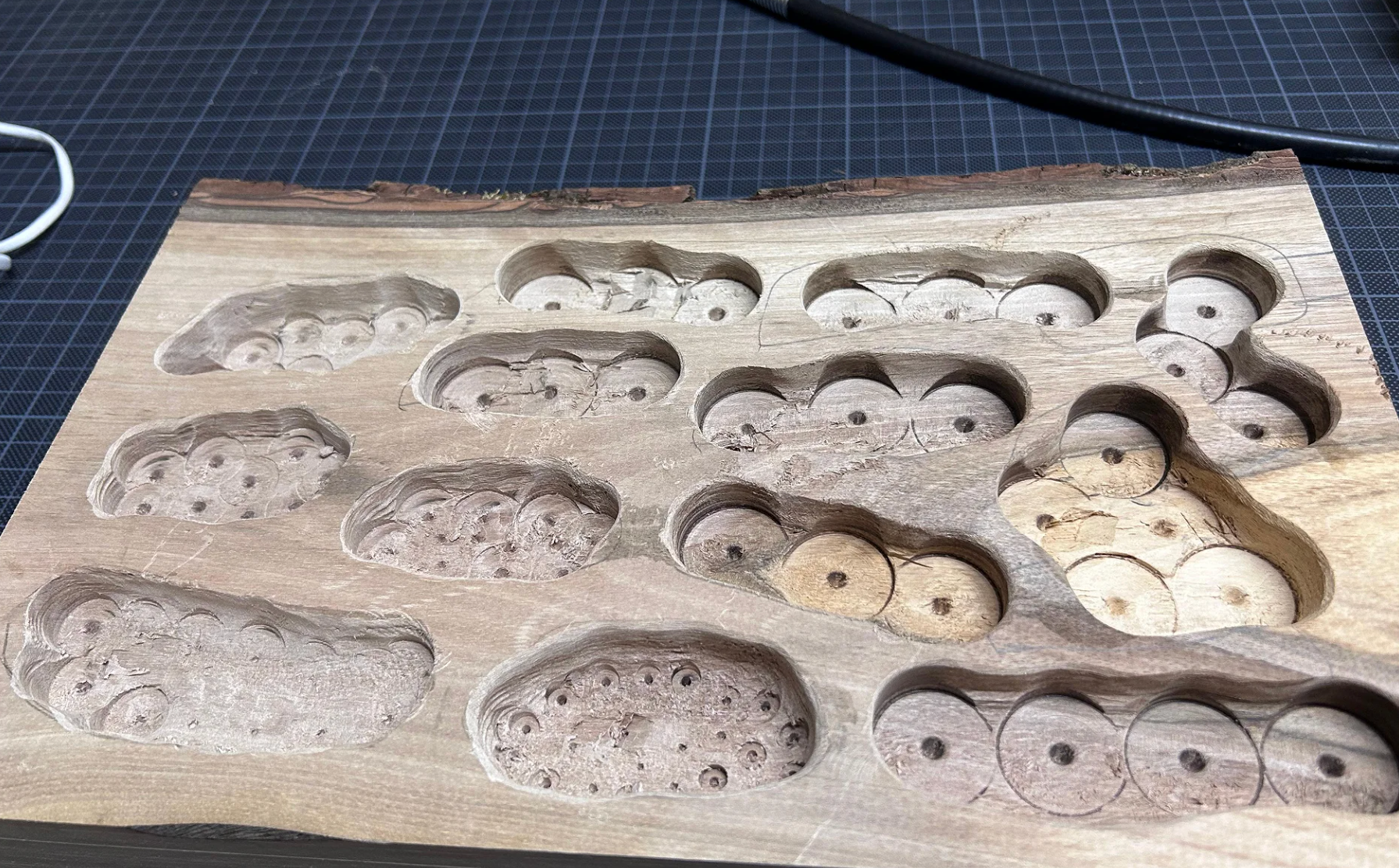 Anbei ein paar Bilder vom Holzstück aus der Schreinerei bis zum fertigen Nest. Es handelt sich um Nussholz, als Laie musste ich die volle Dröhnung an Erfahrung sammeln, was es heisst, Hartholz zu bearbeiten.