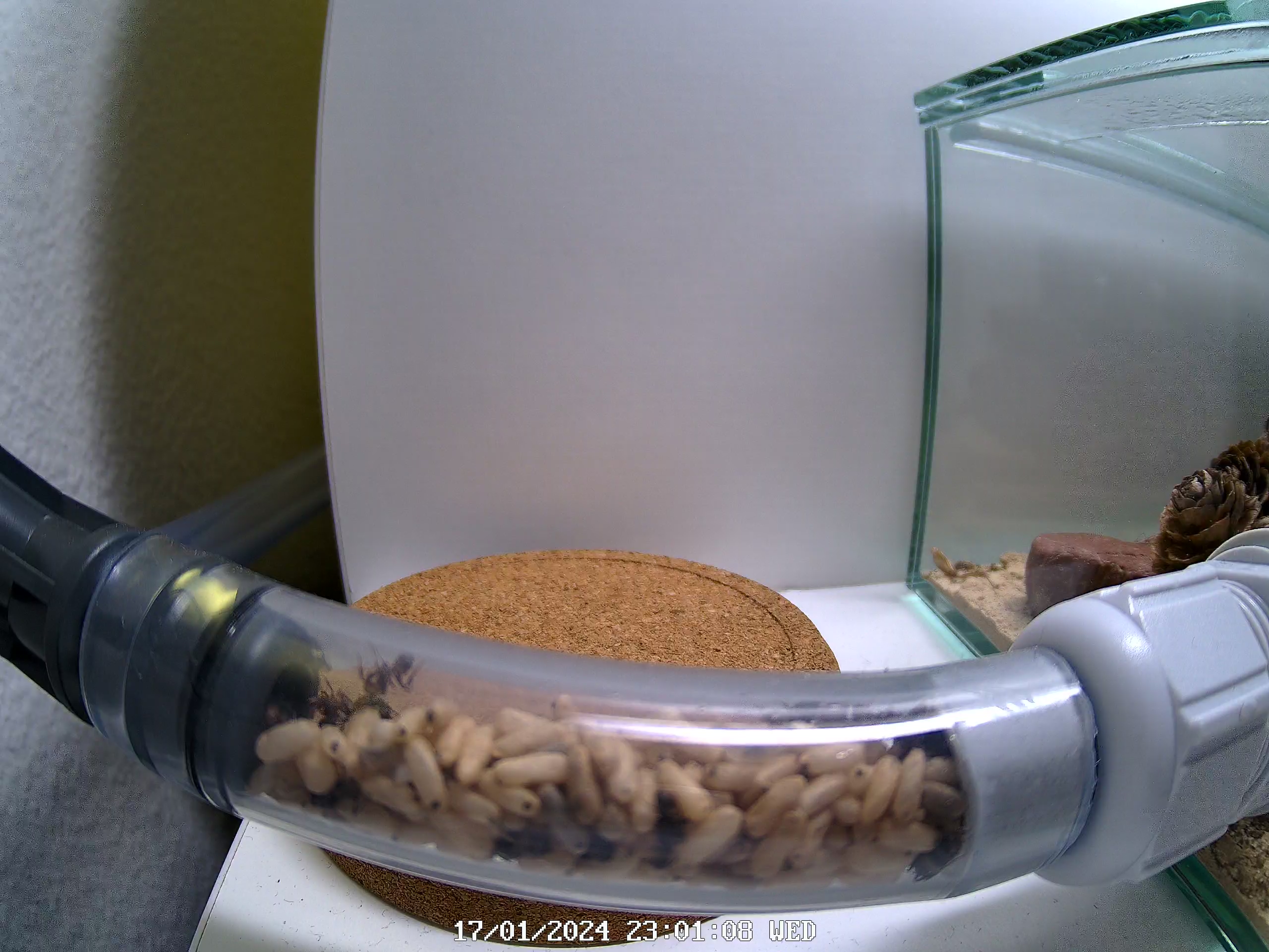 Die Kammer unten in der Mitte, welche via Schlauch als erstes erreicht, wird, dient momentan noch als „Abfall-Aufbewahrungsort“. Bin mir aktuell noch unsicher, ob die Kolonie einfach noch zu klein ist oder ob evtl. das Holznest gar nicht passt für die Ansprüche? Geduld – vielleicht kommt das noch – oder habt ihr eine Idee?