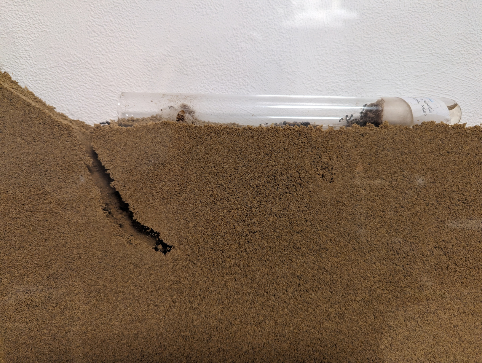 Allerdings verlangsamte sich kürzlich die Grabetätigkeit und ich bemerkte endlich dass sie wirkten wie auf Futtersuche (ich glaube sie waren durch den Honig über mehrere Tage gut versorgt). Ich hatte die Rampe zum Schlauch (den ich neu organisieren muss, denk ich , ich glaube sie stehen nicht so auf Loopings) mit Trockenerem Sand gebaut und ihnen da ein paar Körner hin geworfen die über Nacht auch im Nest verschwanden.
