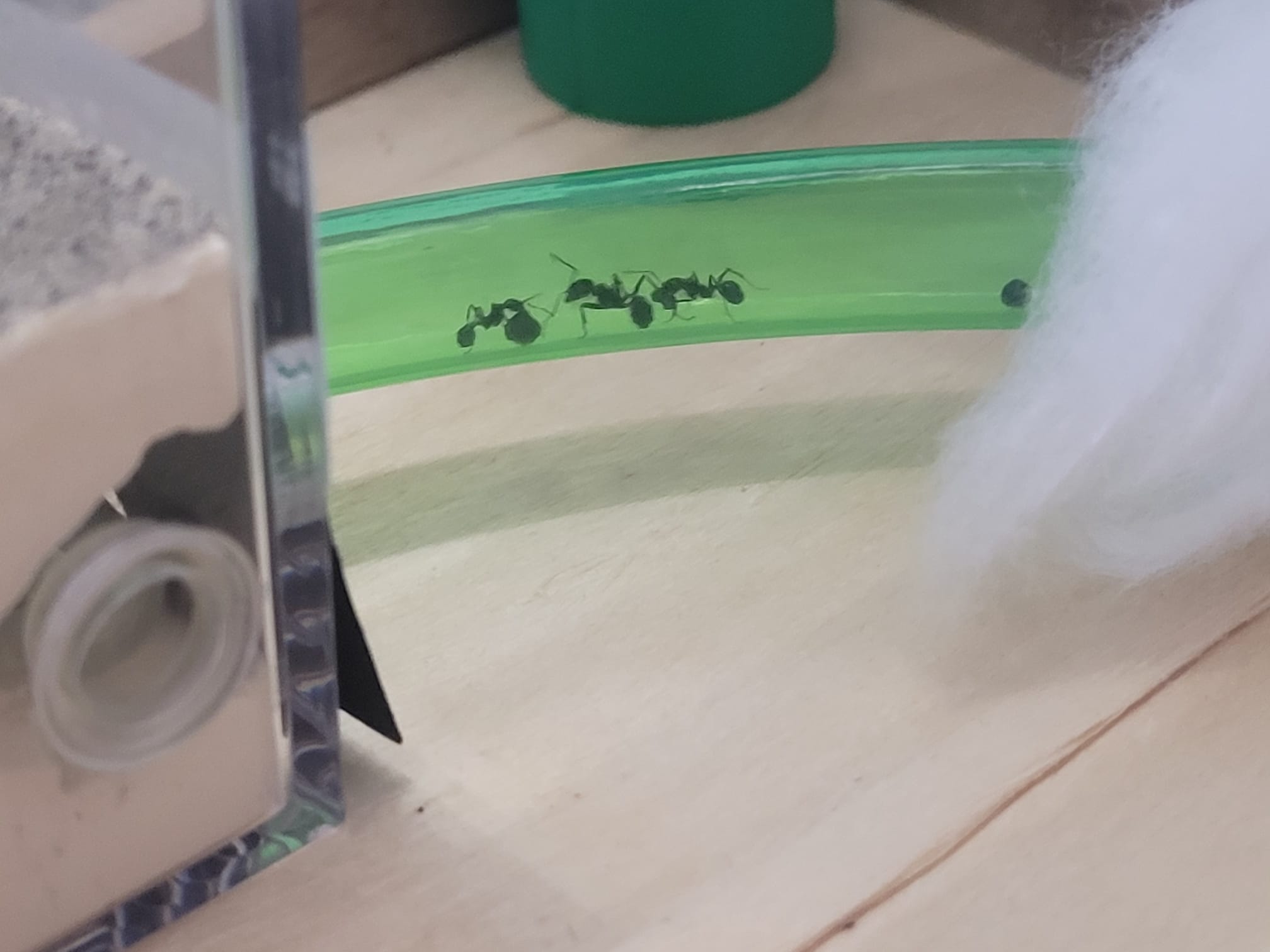 Für die Kolonie hatte ich zu Hause noch einen einen kleinen 5.7x5.7cm Würfel direkt mit integriertem Nest und Areana rumliegen. Da dieser einen 1cm Anschluss hat, musste ich da für den Übergang zum Reagenzglas etwas mit Watte basteln damit mir nicht gleich alle ausbüchsen.