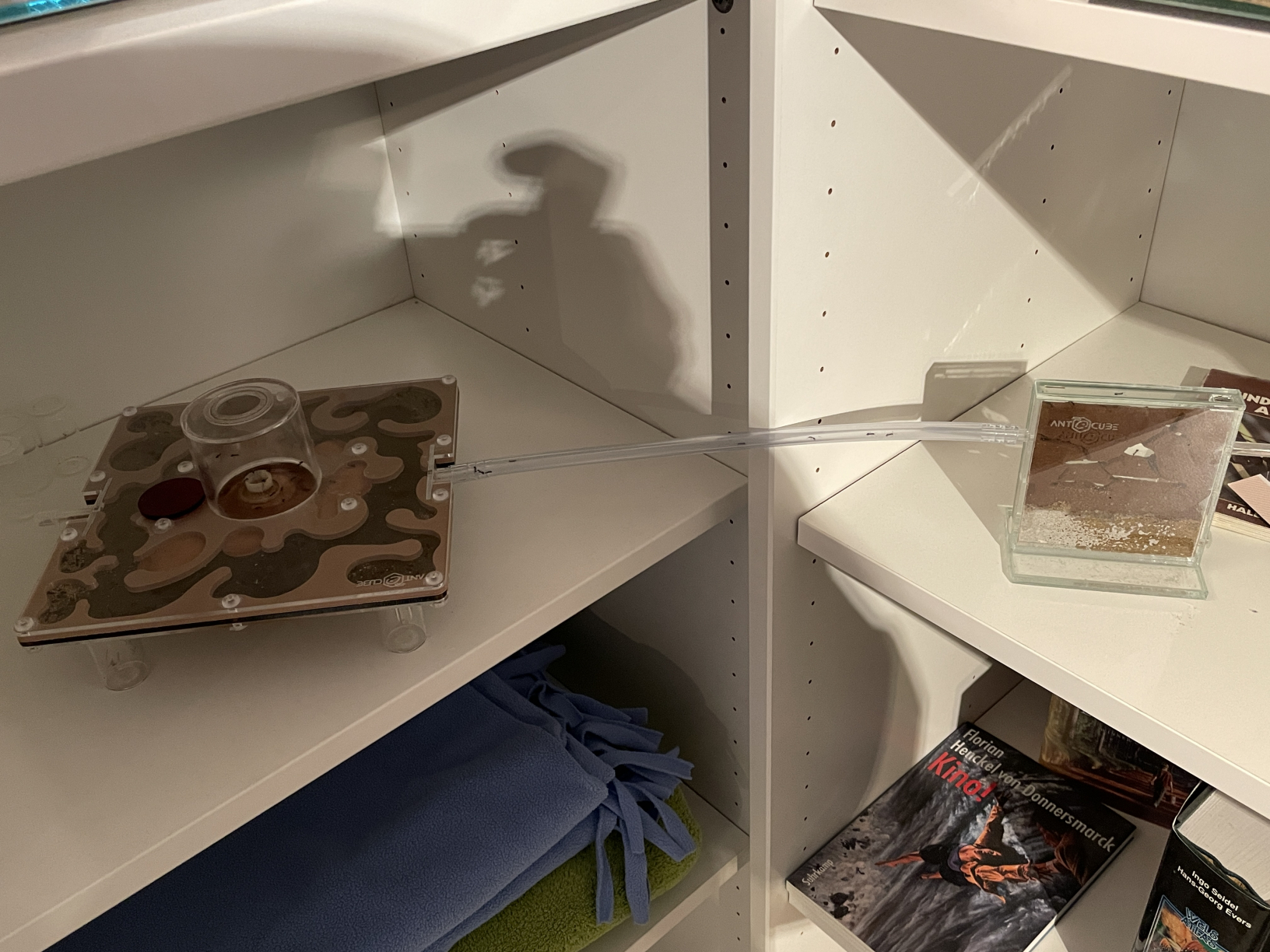 Gestern hab ich dann mal noch genauer geschaut und was entdeckt! Eine kleine Höhle! Kaum zu erkennen ⊠und zwar ist ja bei dem 3D-Nest, das ich habe, in der Mitte so eine Art GipsflĂ€che zum Befeuchten des Nestes eingebaut. Diese hat sich leicht gewölbt in den letzten beiden Jahren, ich hab einfach echt angenommen, ok, die wird langsam porös und irgendwann muss ich das Nest ersetzen ⊠đ ⊠aber: die kleinen âFreggerâ haben ein klitze kleines Loch am Rand zur Plastikeinfassung und gehen da heimlich ein und aus! Von unten kann man nur ein kleines bisschen sehen und da wimmelt es von Ameisen drin! Und! Und! Und! Ich glaaaaaaaaube, ich hab ne