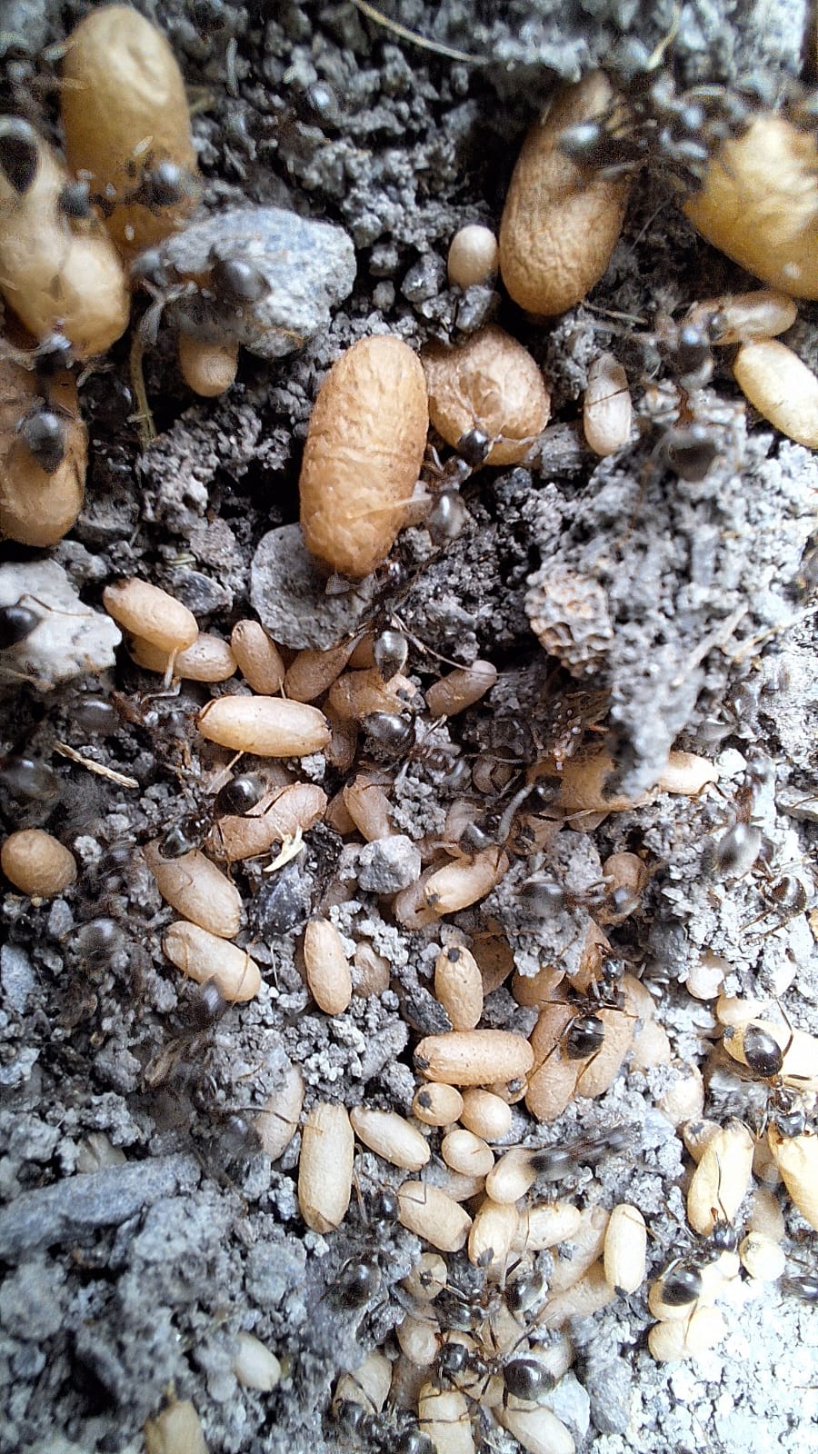 Ich habe beim Unkraut jäten das Puppenlager einer Lasius cf. niger Kolonie gestört. Super Vergleich der Royalen und der Arbeiterpuppen.