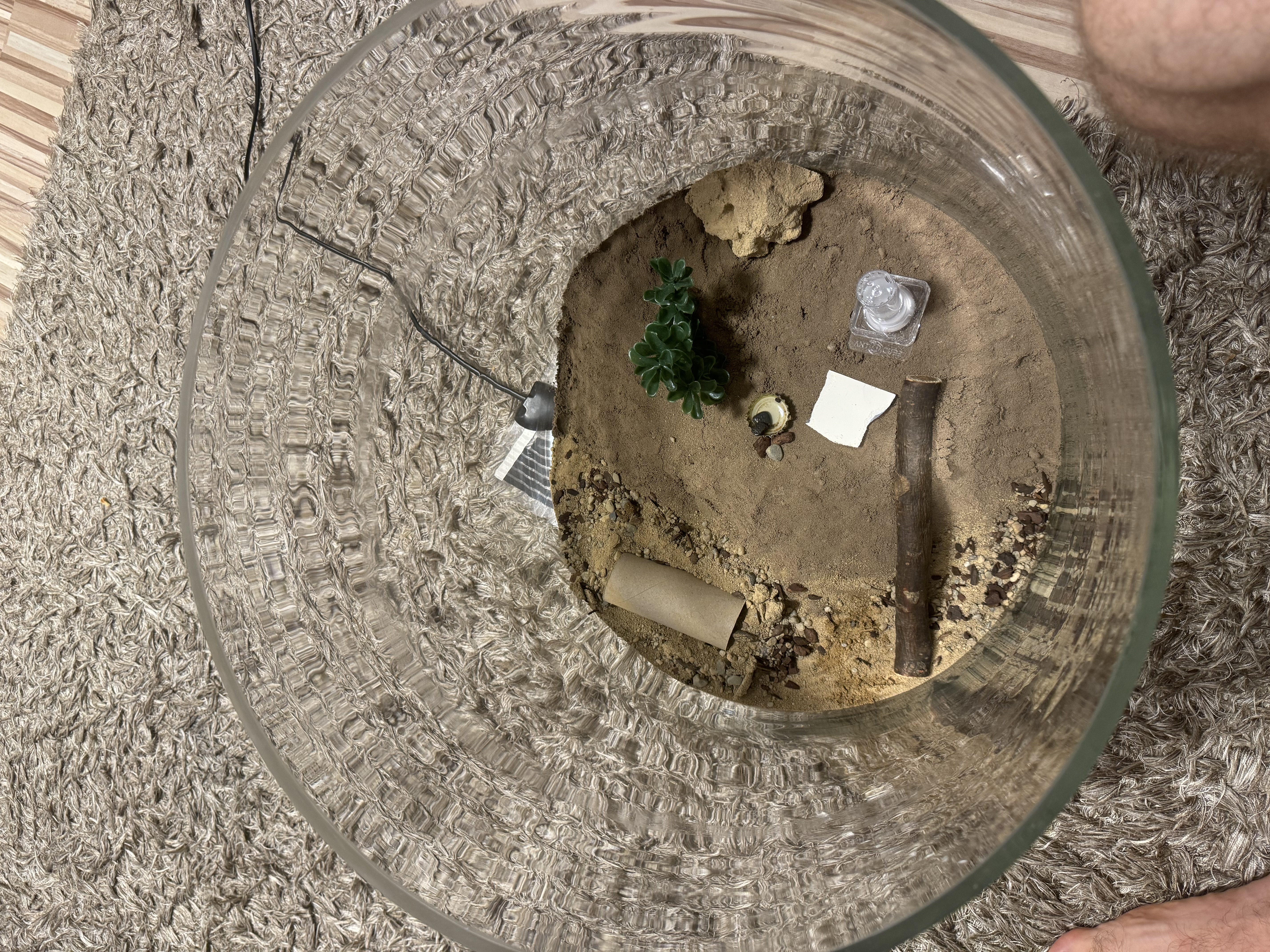 Ebenfalls problematisch wäre in dem Zusammenhang, dass du die Arena ja beheizen möchtest. Feuchte Arena plus Beheizung führt sehr schnell zu Kondensation, wenn sich der warme aus dem Boden verdunstende Wasserdampf an den kühleren Wänden (oder dem Deckel) des Beckens in Form von Wassertropfen absetzt. Das fördert nicht nur Schimmelbildung, es macht auch den Ausbruchschutz schnell komplett wirkungslos. Mit einer Wärmelampe wäre das etwas weniger stark ausgeprägt, weil die ja die Wände mit aufheizt, bei Wärme von unten kann man da schnell die komplette Scheibe voll mit Kondenswasser haben.