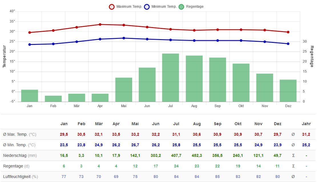 Sollte eigentlich gar nicht so schwer sein. Man braucht nur ein Interface welches sich täglich den Wetterbericht der Zielregion per WebAPI holt und dann deine Geräte entsprechend darauf einstellt. Richtig coole Idee!Ich möchte das Klima so weit wie möglich dem auf den Philippinen nachstellen. Dabei wollte ich mich auch an jahreszeitlichen Schwankungen (Sommer-/Regenzeit) orientieren. Zum Glück gibt es für so was Klimatabellen. Vielleicht erfindet mal jemand ein System, das automatisch die Bedingungnen nachstellt, die an einem ausgewählten Ort herrschen.