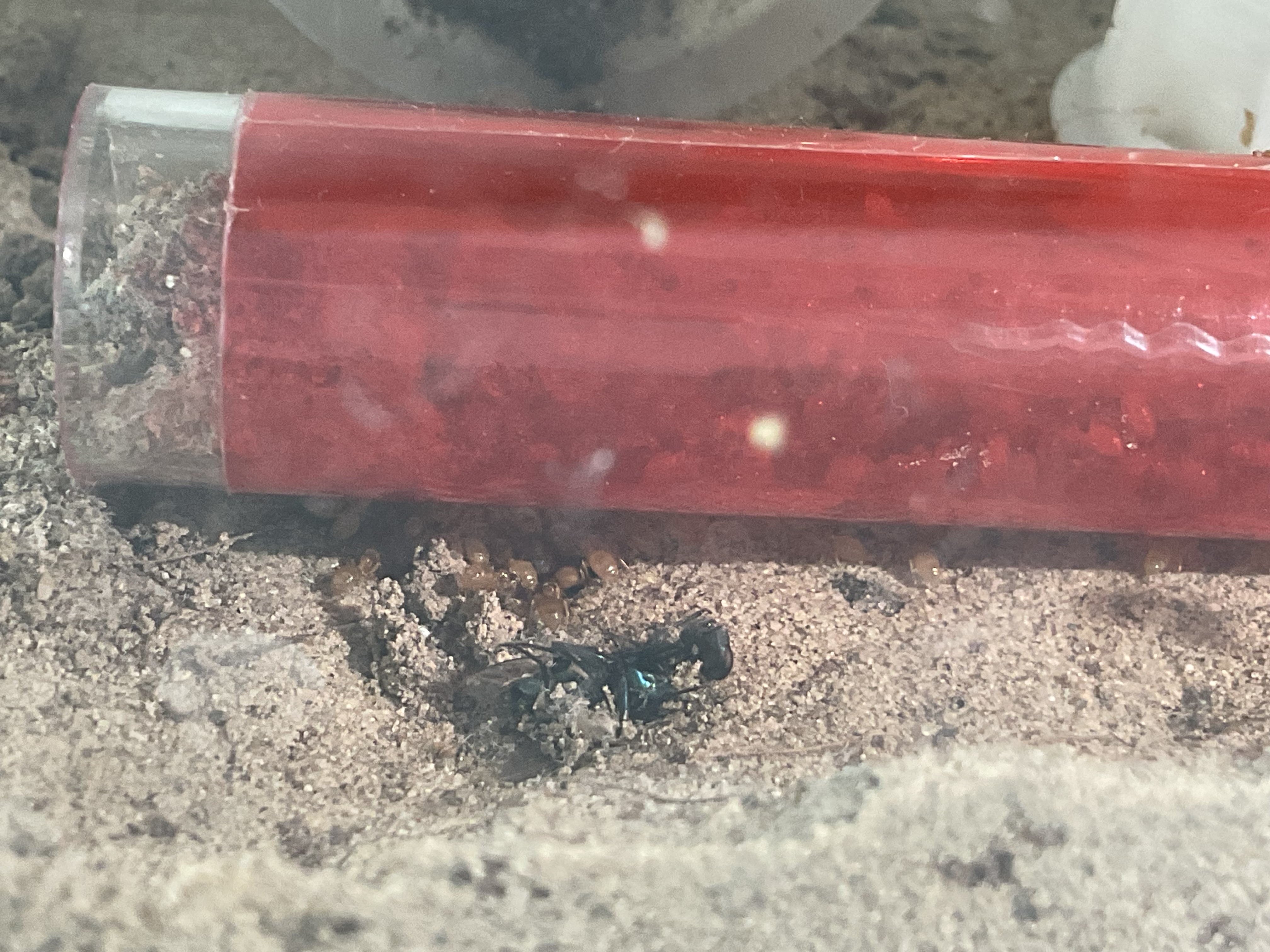 Heute gab es nochmal eine Fliege, die anscheinend gut ankam. Sie haben sich sofort darauf gestürzt und weitere Arbeiterinnen rekrutiert. Hier könnt ihr es sehen: