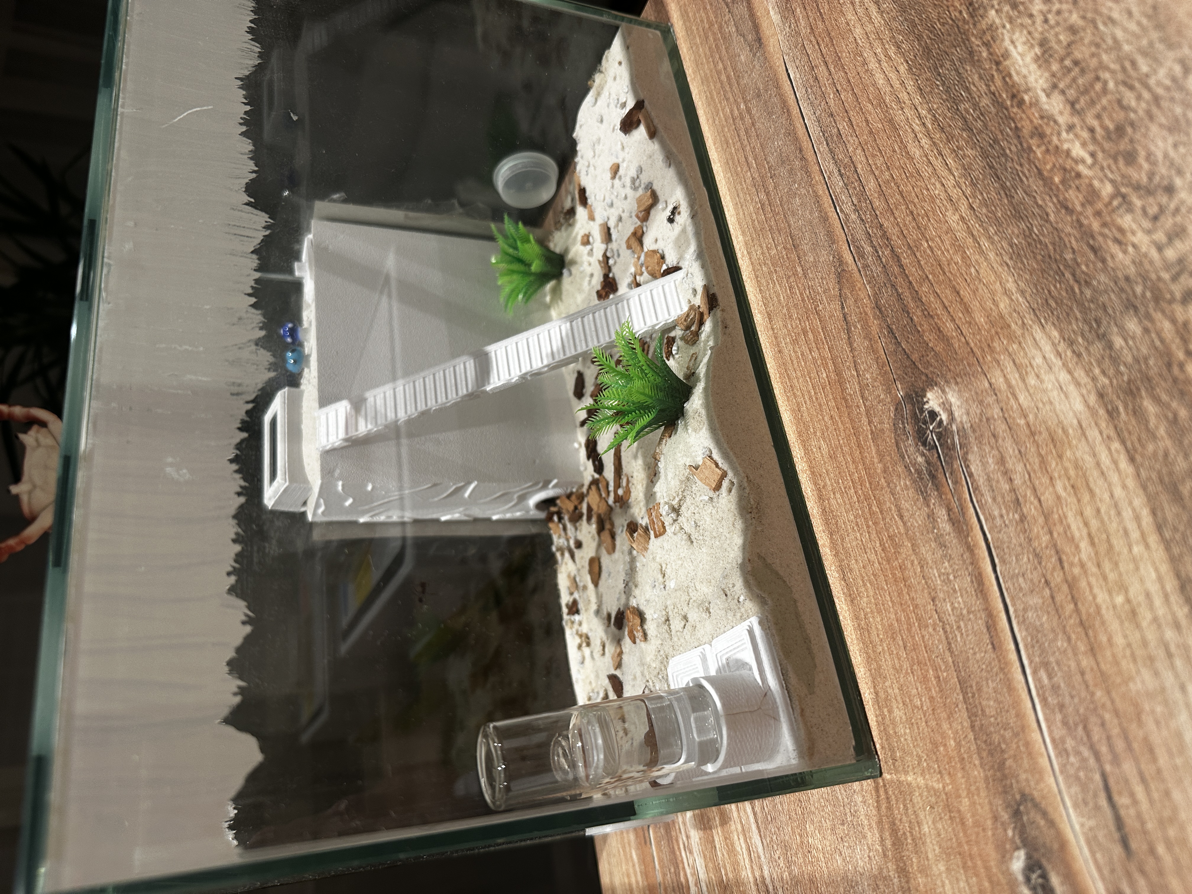 Der Boden ist mit dem mitgelieferten Sand, Steinchen und Rindenstückchen befüllt. Es gibt eine Station mit Wasser, Zuckerwasser und ein Schälchen mit der Futtermischung. Alles wird regelmäßig gereinigt und frisch aufgefüllt.
