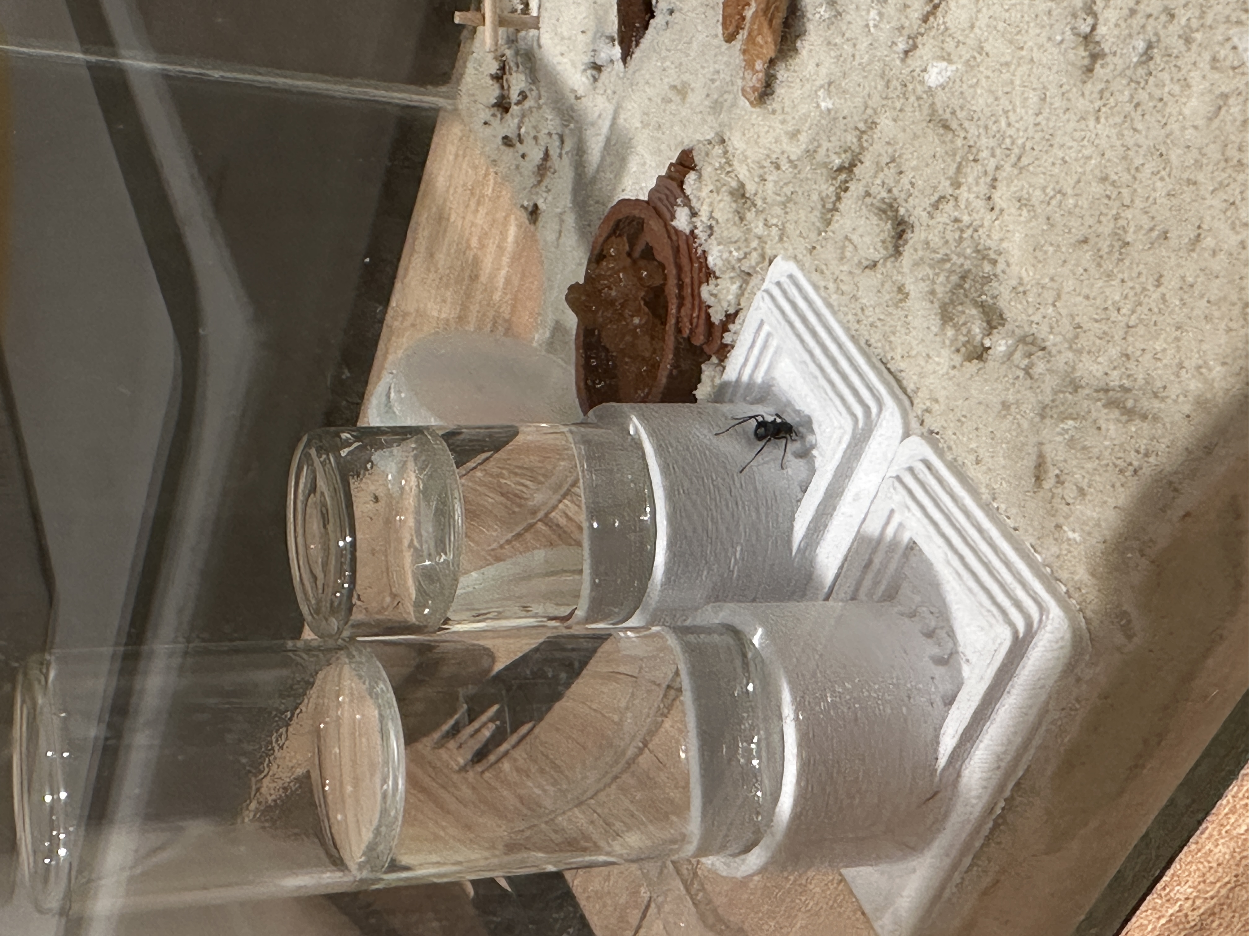 Anfangs war es etwas schwer, da ich nur eine Königin mit 6 Arbeiterinnen erhalten habe, von denen 2 bereits tot waren und weitere zwei in der ersten Woche noch gestorben sind.. Der Umzug aus dem RG passierte relativ schnell bereits nach 2-3 Wochen. Die Ameisen haben sich von Anfang an wohl gefühlt, würde ich behaupten und haben angefangen Ihren Eingang zuzubauen und die mitgelieferte Futtermischung zu fressen. Nach ein paar Wochen habe ich kleine Heimchen < 5mm gut gefüttert und dann eingefroren und gebe diese wöchentlich, je nach Bedarf. Auch diese wurden sehr gut angenommen, sodass die Futtermischung nun links liegen gelassen wird. Die Heimchen mittlerweile aber auch.