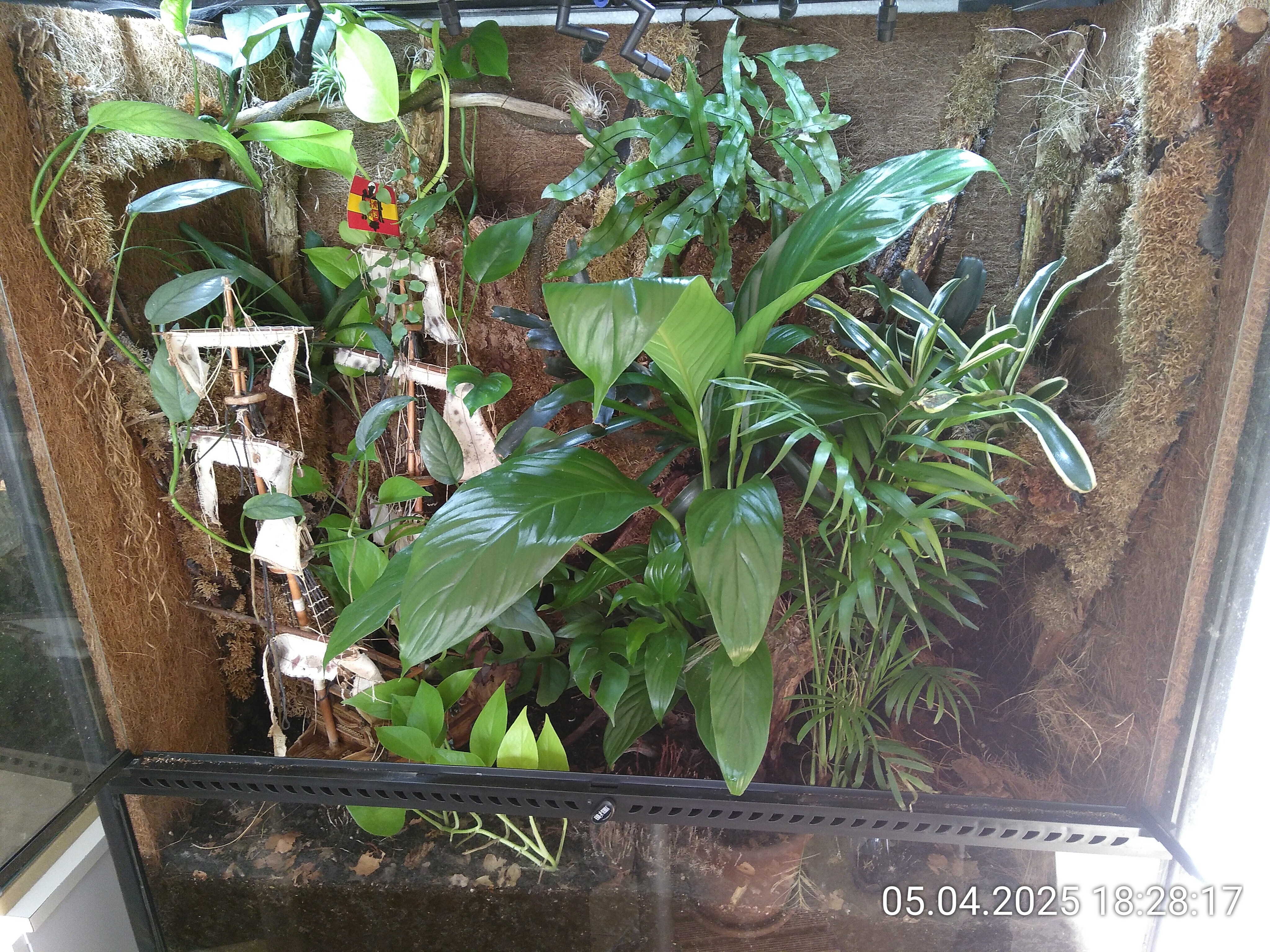 Scheiben putzen und der Frühjahrsputz ist fertig. Den Rest besorgen die Asseln und Schnecken. Hoffentlich kommen bald Ameisen. Es ist jetzt wirklich alles bereit und sieht ungefähr so aus, wie ich mir das vorgestellt hatte. Morgen werde ich noch die Sprühdüsen neu ausrichten. Allein durch das Pflanzenwachstum erreicht das Wasser nicht mehr die Stellen, wo es hin soll.