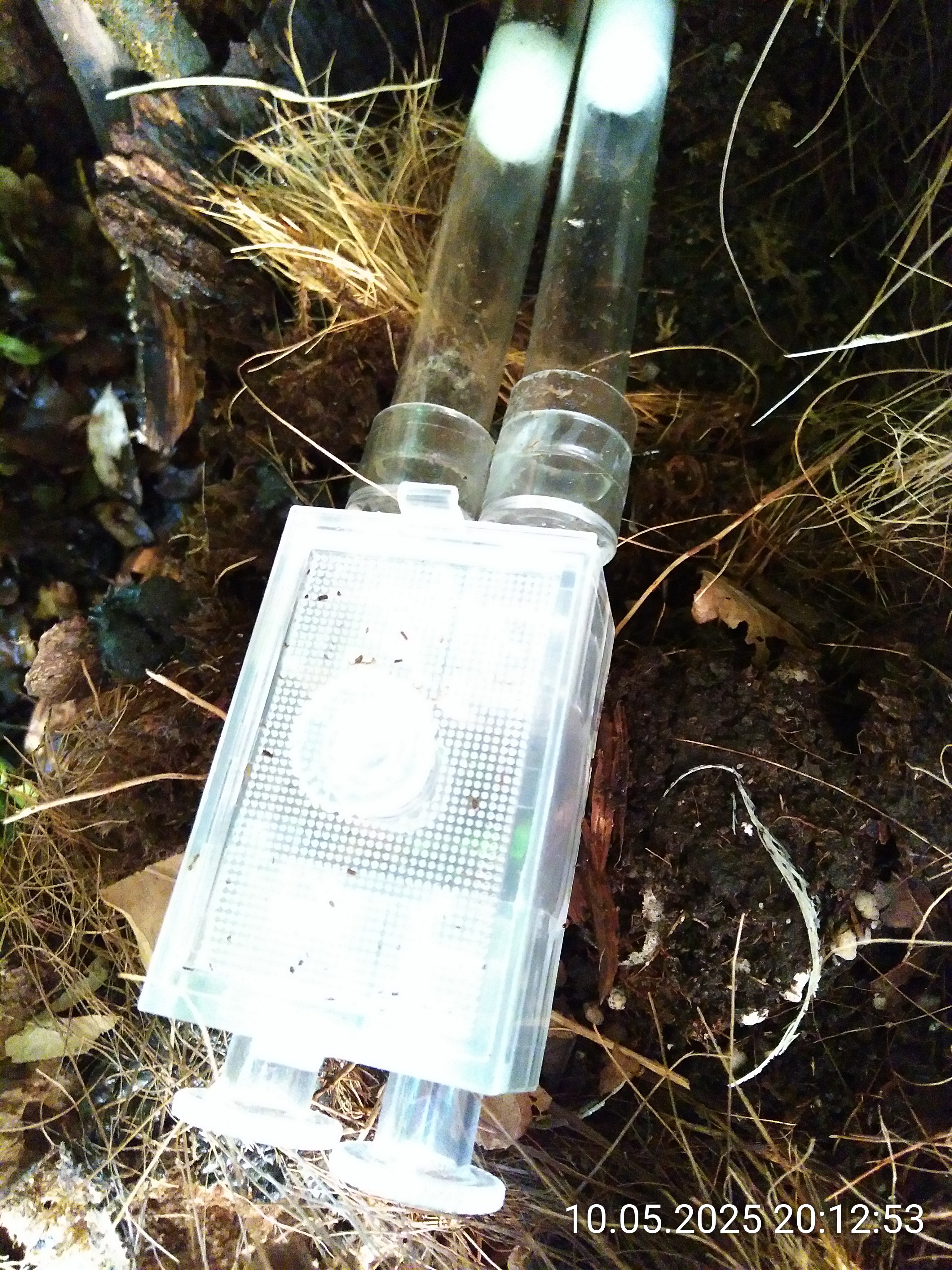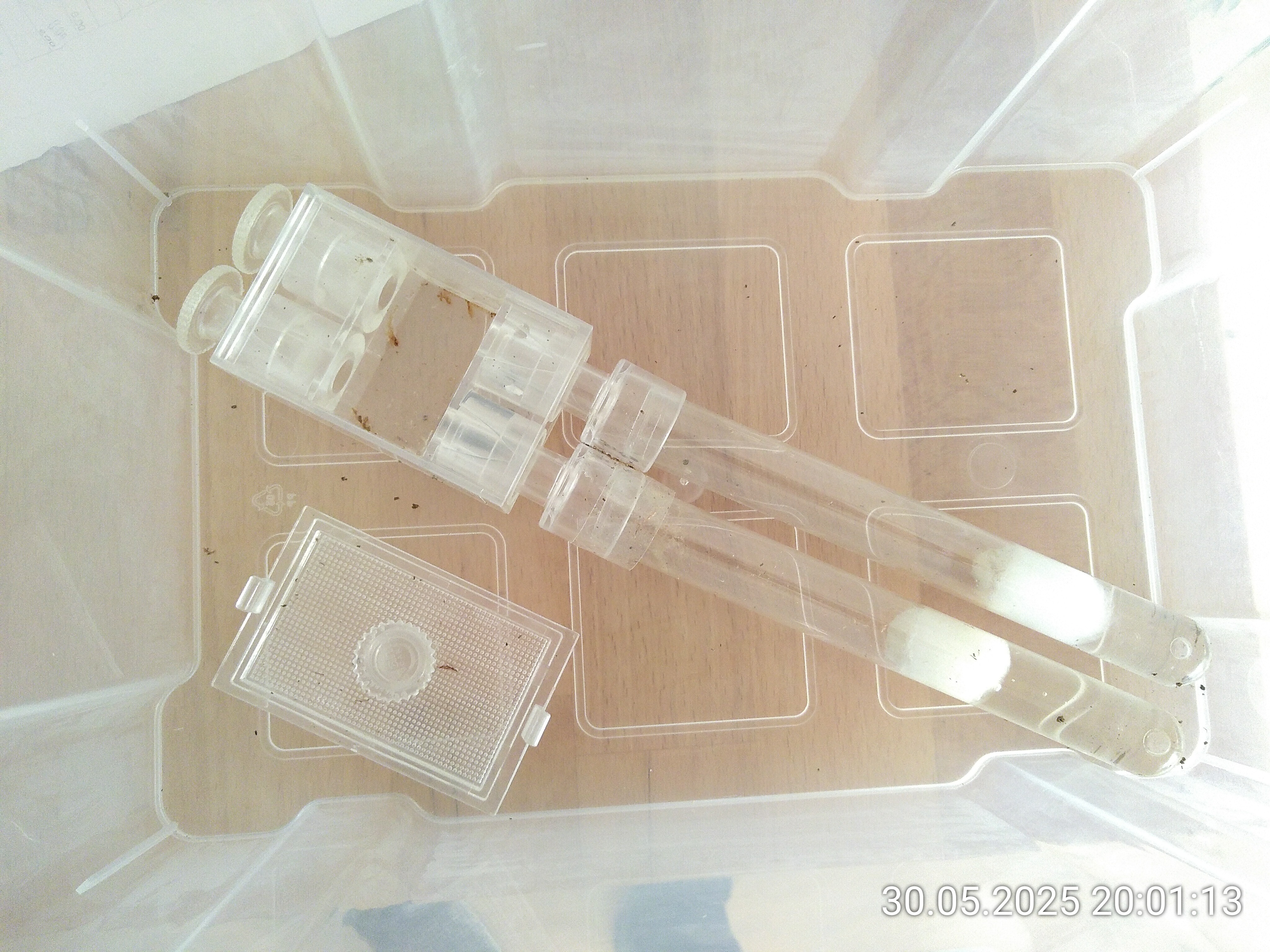 Ihr RG habe ich an eine AntsCanada Mini-Arena angeschlossen, an der auch ein RG mit Invertzuckerschorle hängt. So kann ich sie besser füttern, ohne groß zu stören. Es liegt unten rechts im Terrarium. dort ist es vor der Beregnung geschützt und relativ dunkel. Trotzdem kann sie dort von der feuchten Umgebung profitieren. Die Arena hat auch kleine Löcher für den Luftaustausch.