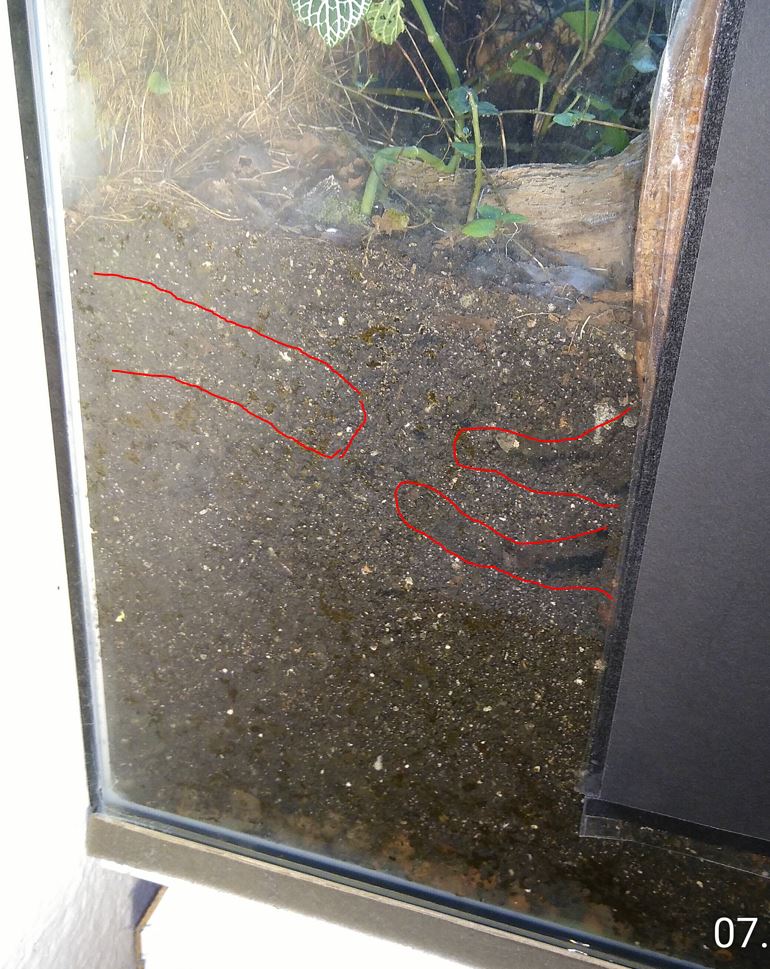 Dafür spricht auch ihre Bauaktivität. Ich sehe immer mal wieder Schnappis mit Erdklumpen zum Nest (?) laufen. Das hätte ich eigentlich anders erwartet. Mittlerweile kann ich nämlich durch die linke Seitenscheibe einige ihrer Gänge und Kammern sehen. Bis zum Baumstumpf sind sie schon gekommen. Gestern habe ich auch zum allerersten Mal eine Schnappi darin laufen sehen.